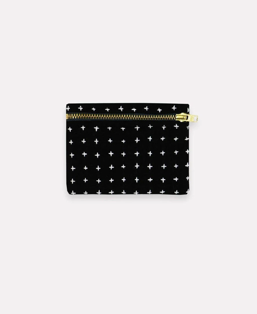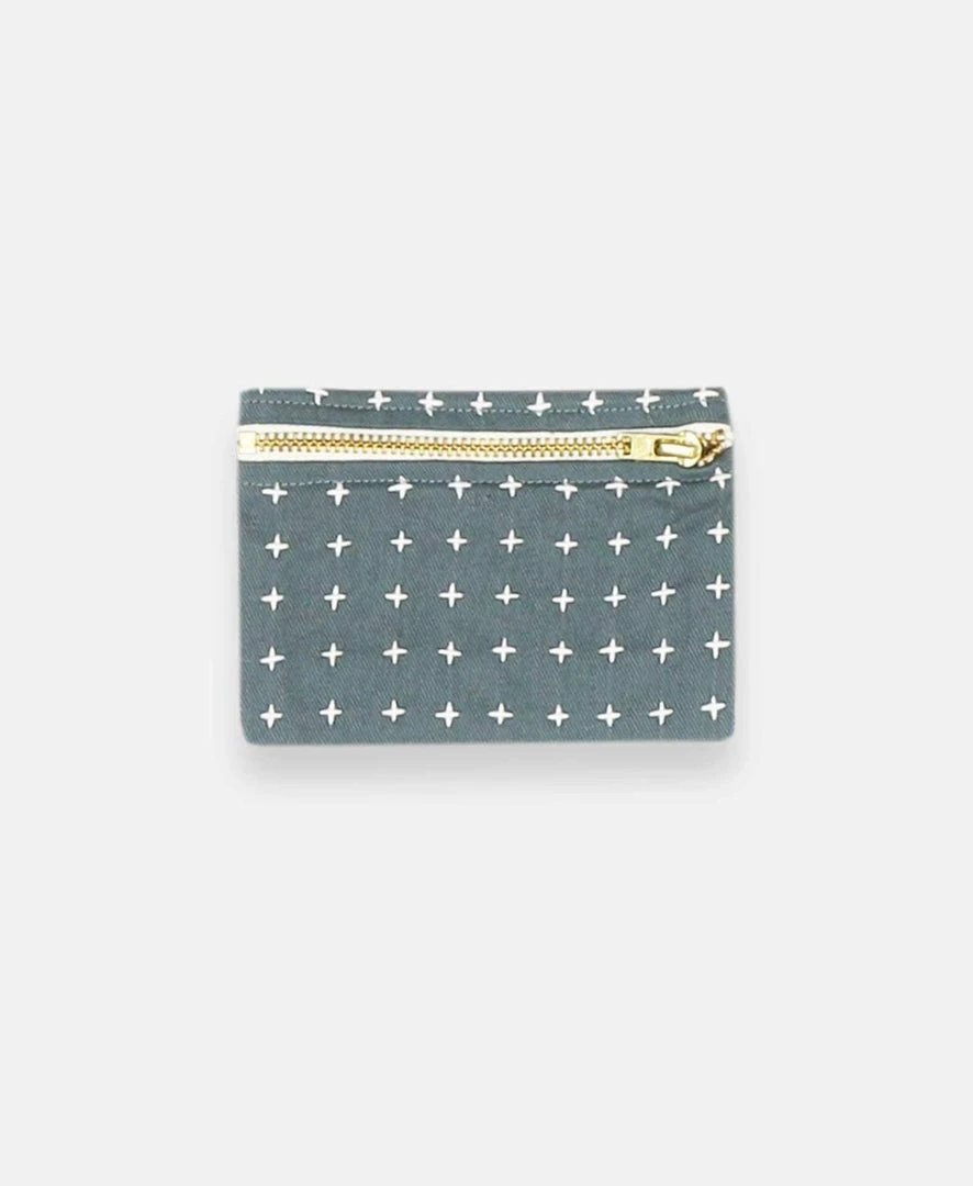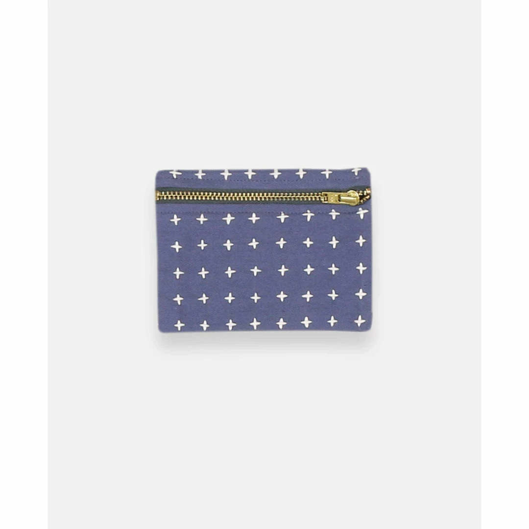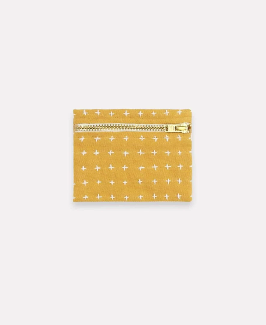 This coin purse is perfect to store loose change, business cards or even your headphones. Handmade from organic cotton, this charming pouch features a gold-tone zipper accented with tiny cross-stitch detailing against a bold background.