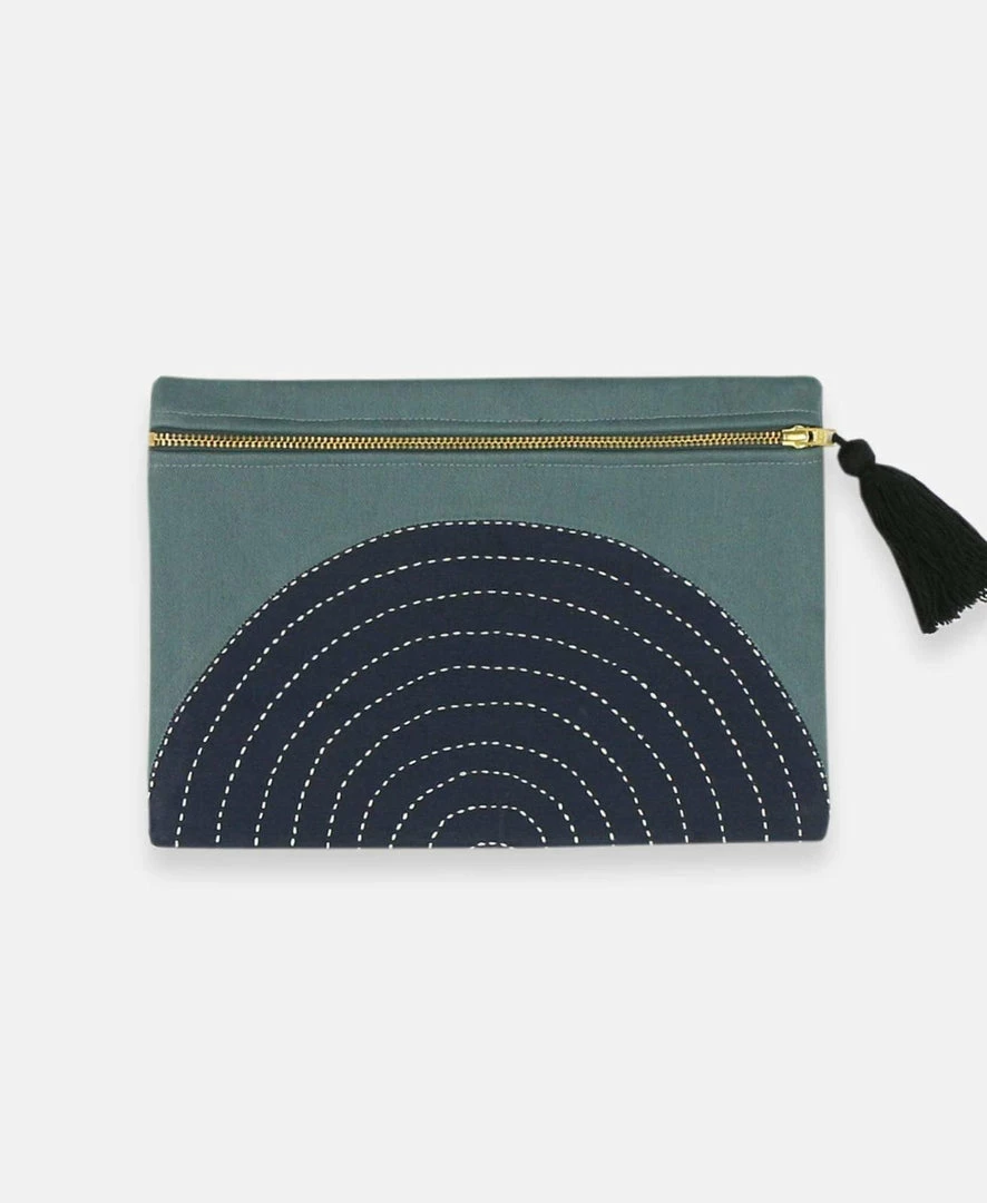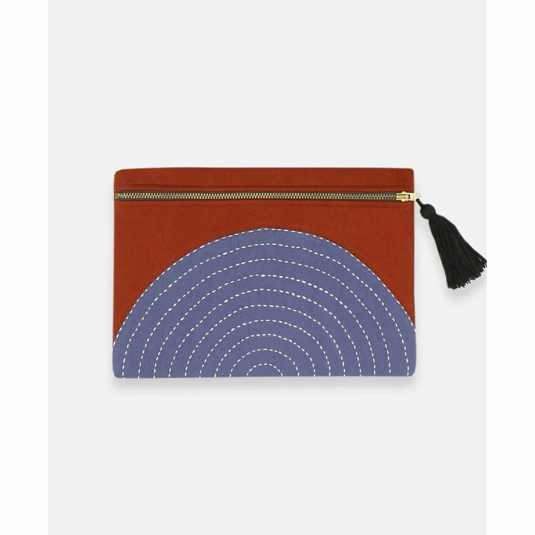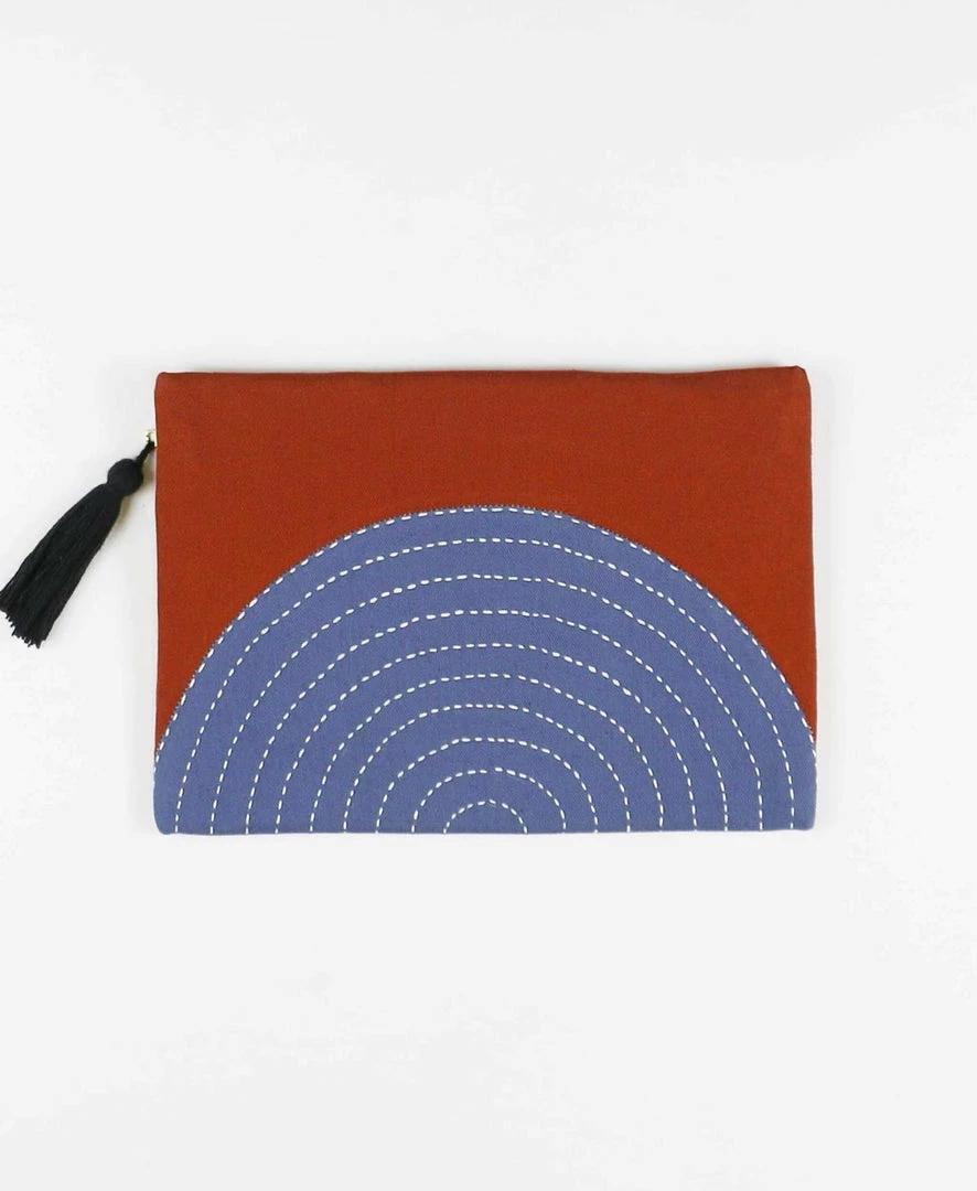 This beautiful contemporary pouch complete with a tassel zipper pull, features a colorblock concentric design and charming stitch details. Made with organic cotton, use it to stay organized, store makeup, a cellphone or important receipts.