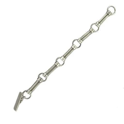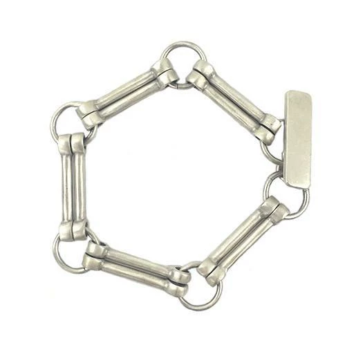 - Silhouette: hand-fabricated ringed links connected by a toggle clasp