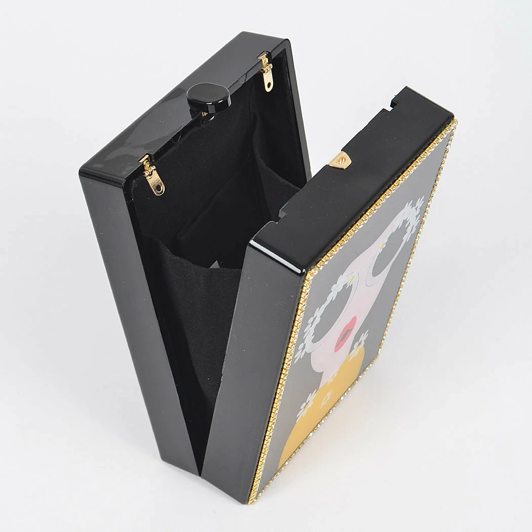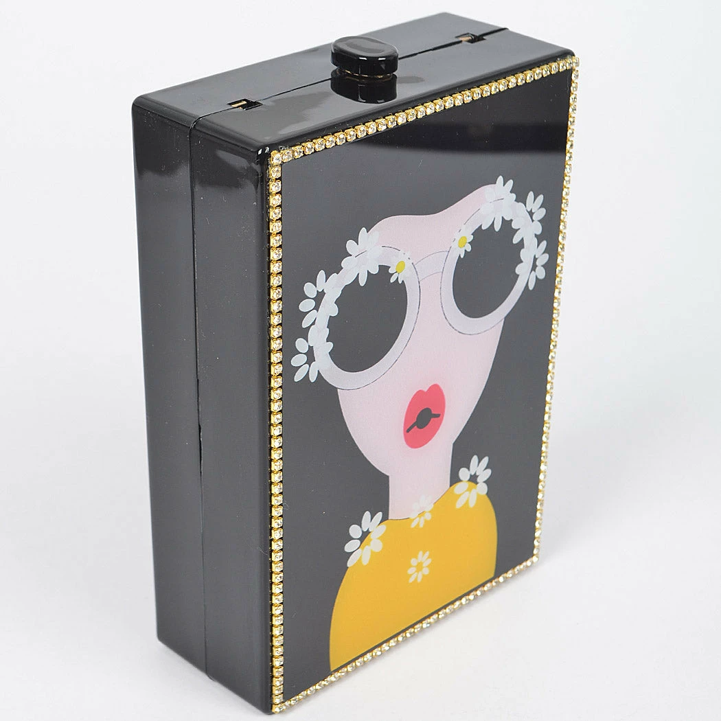 Everything’s coming up daisies for this acrylic cutie! The box style handbag features a fun fashionista with floral accents on their eyeglasses and happy yellow top. Opening from the top, while the interior is spacious enough for your phone and other small essentials. A detachable chain strap allows the bag to function as a clutch or shoulder/crossbody style. Whatever you choose, this accessory will always be in bloom!