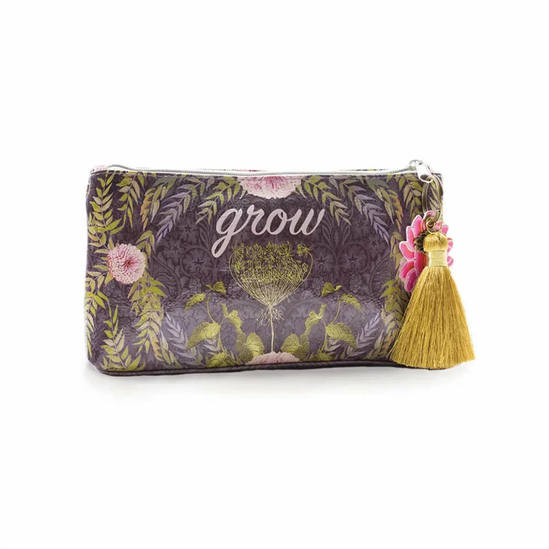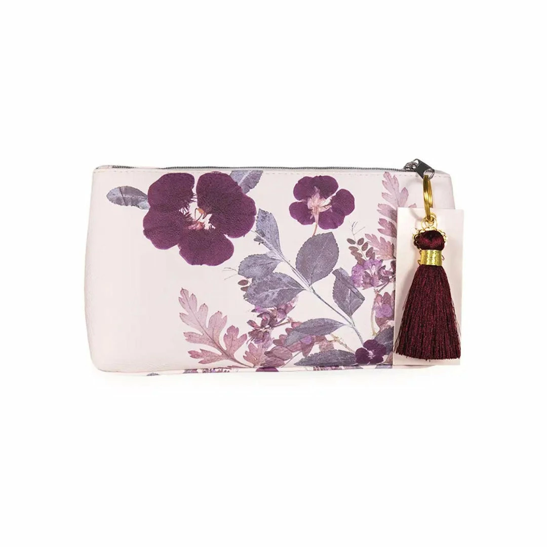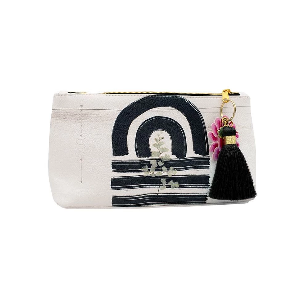 Pretty enough to use as an everyday clutch and durable enough for organizing makeup, jewelry, art supplies and more. Small Tassel Pouches come with a coordinating luxury tassel and lotus charm which can be removed and used as a key chain. Pouches are made using a durable oilcloth-like material and have shimmering, illustrated satin linings. Pair as a set with the Large Tassel Pouch for the perfect travel accessories.