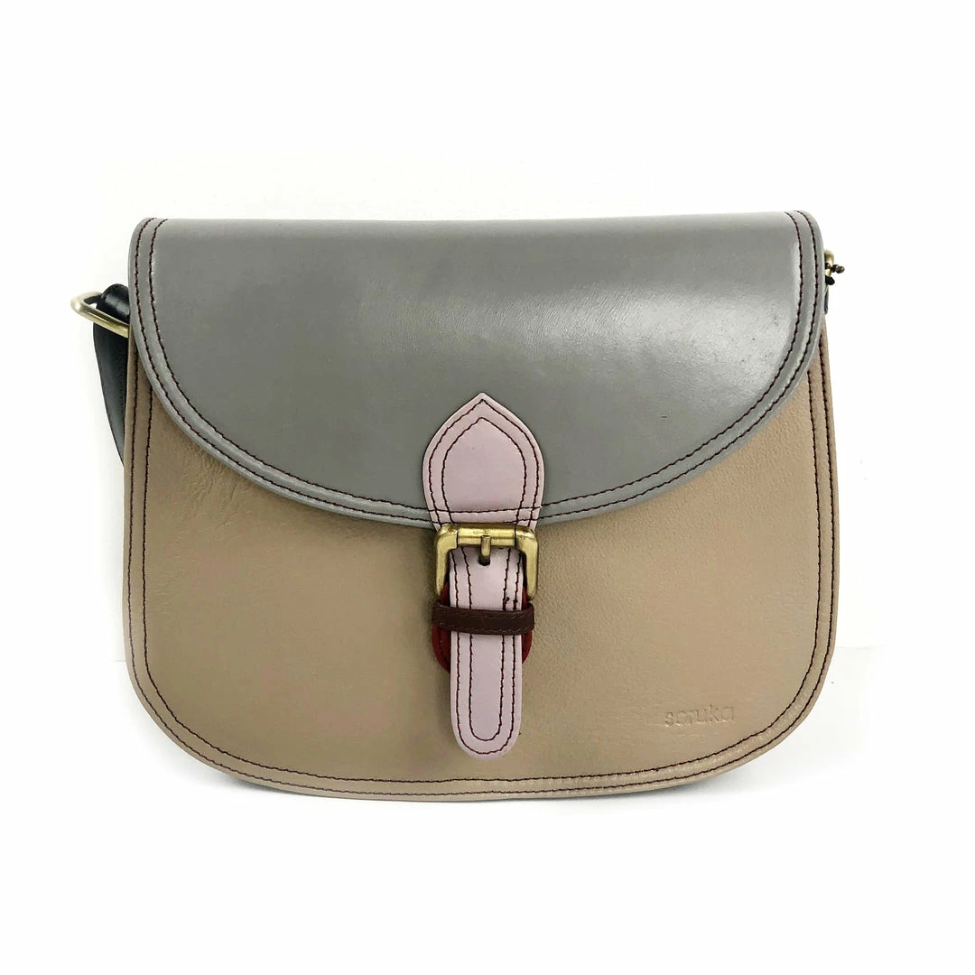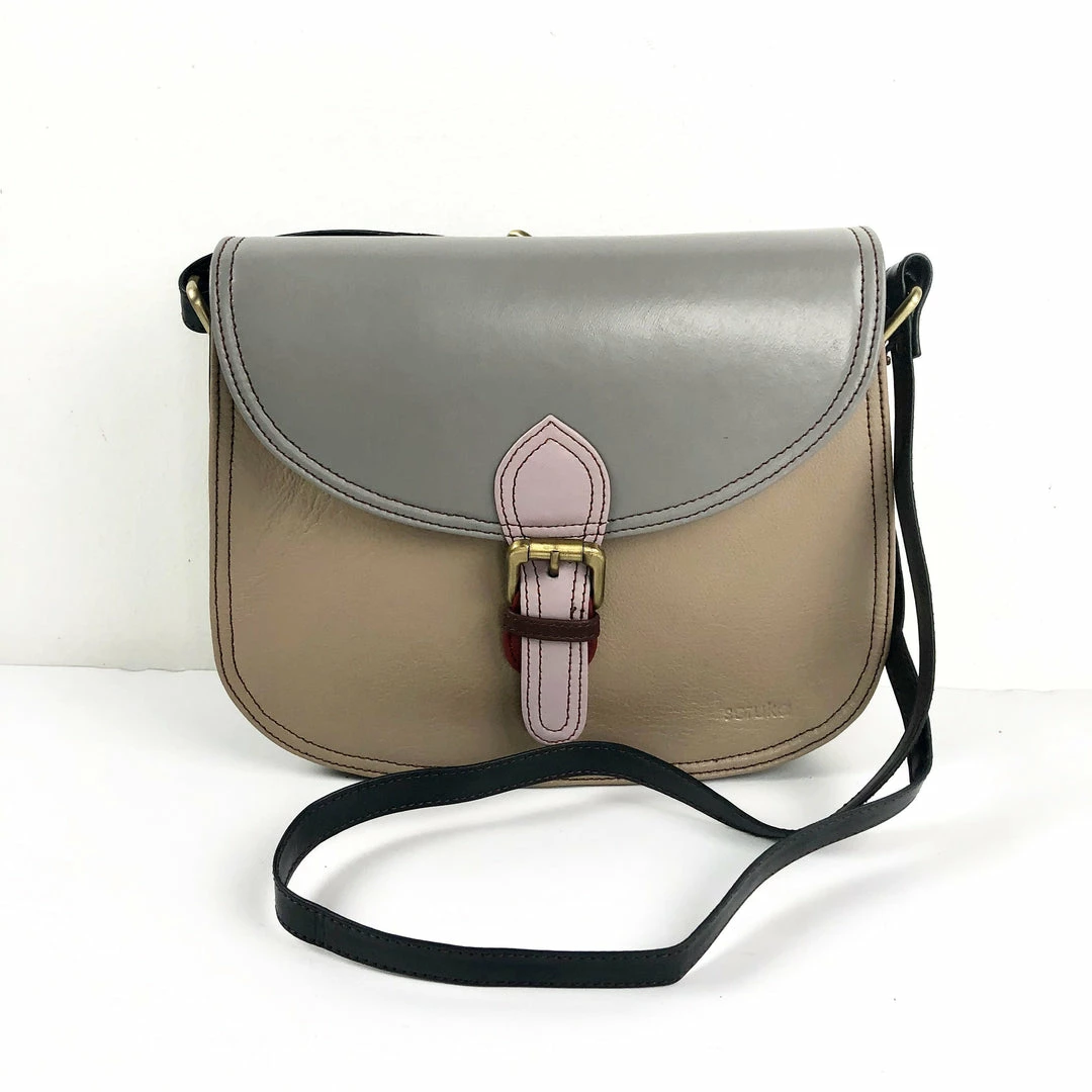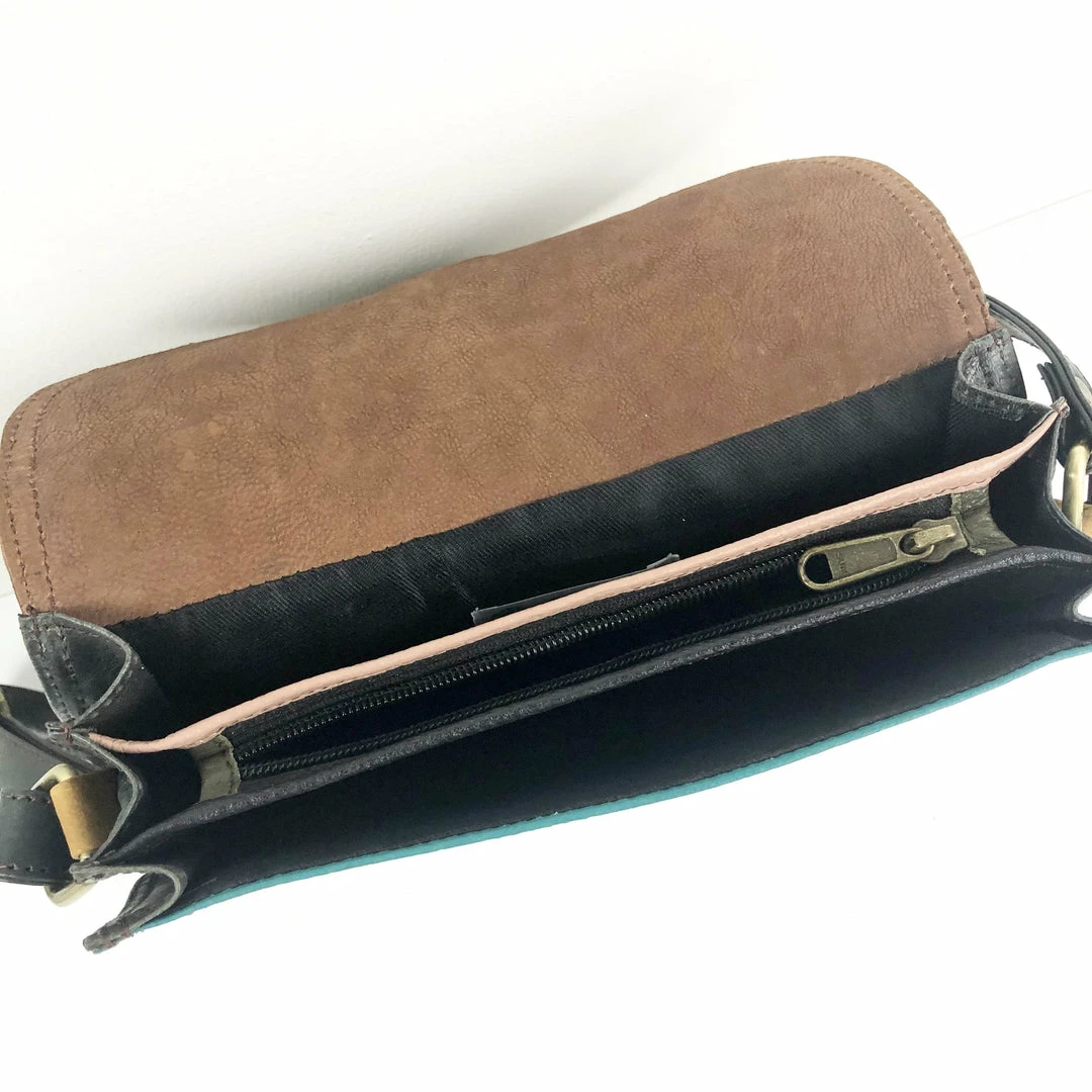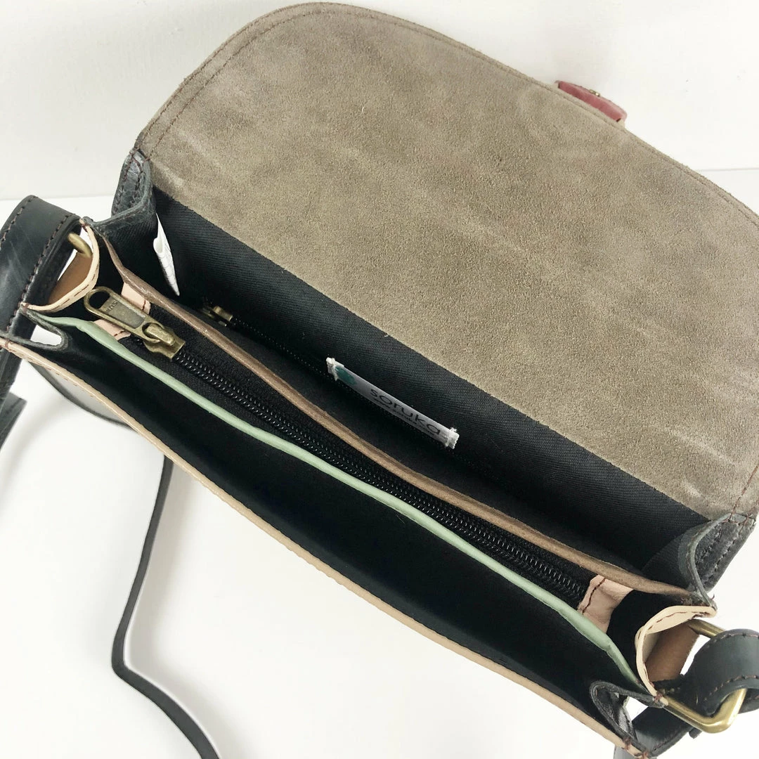 Soruka bags are designed in Barcelona and handmade though fair trade practices in India. The bags utilize recycled leather scraps that may include some imperfections and are zero waste. No two bags are the same.