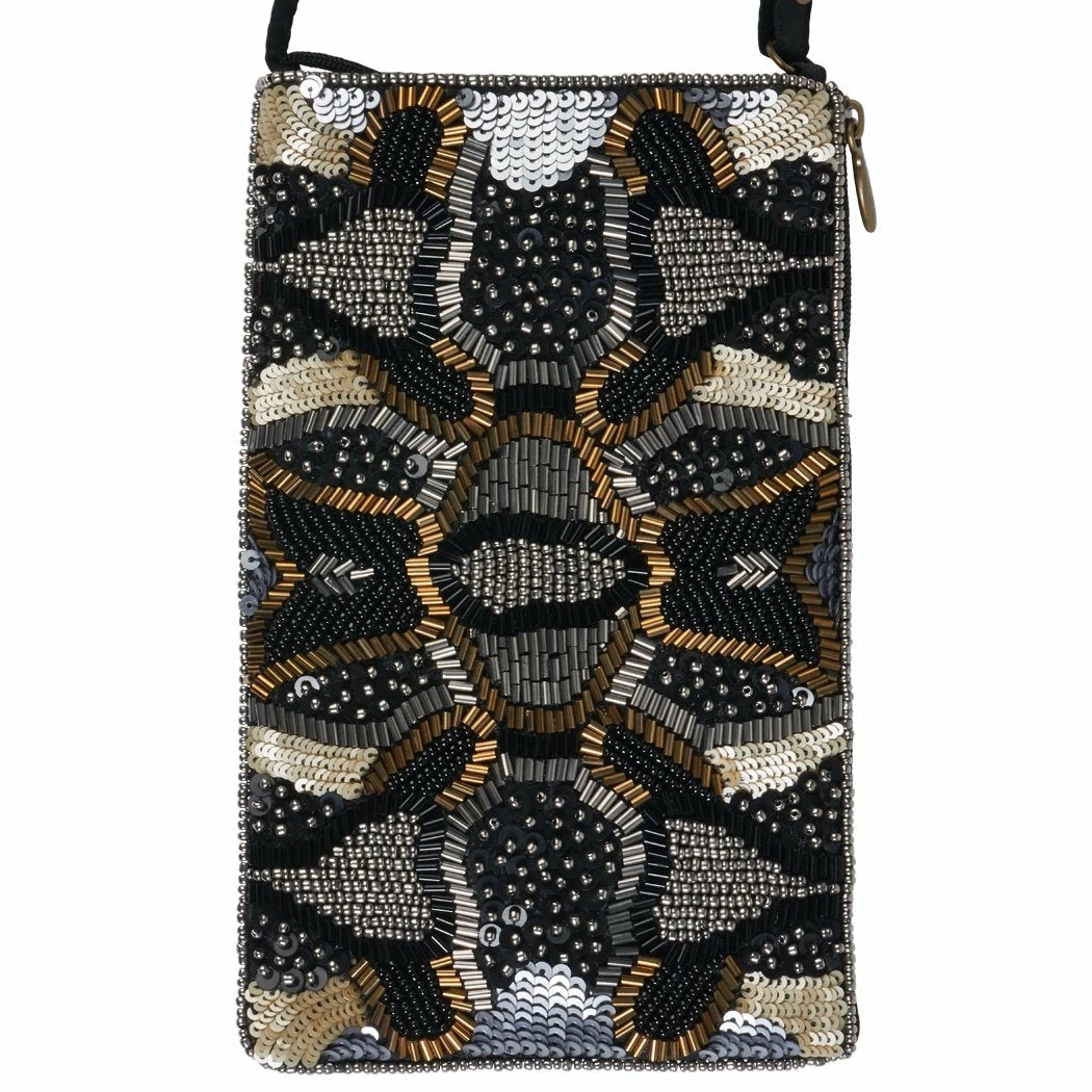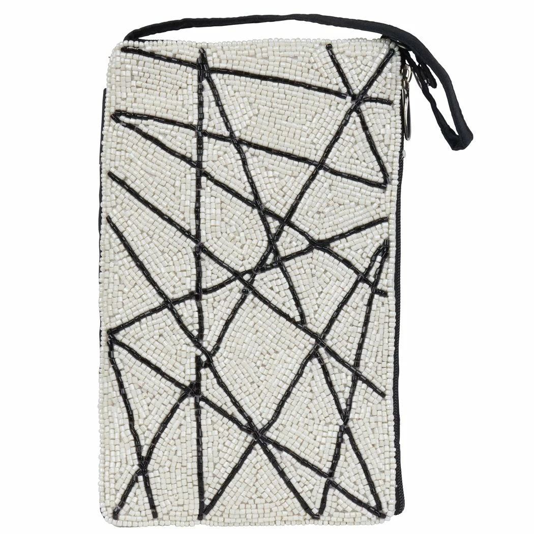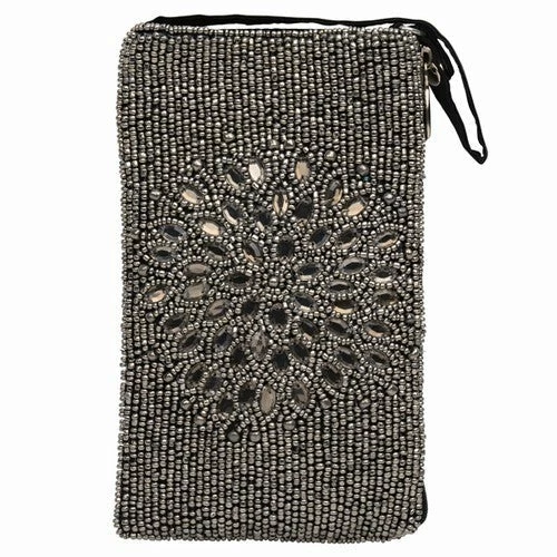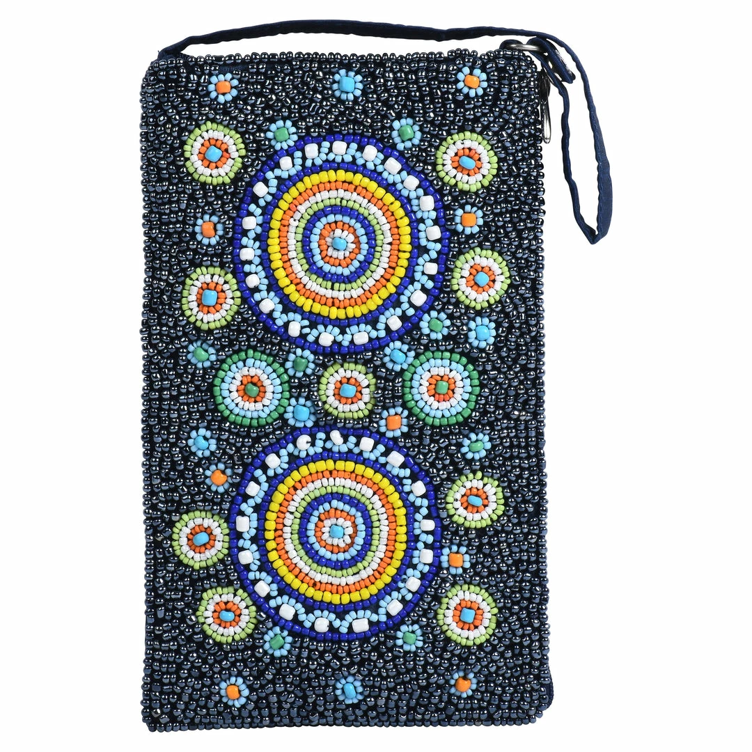 Hand beaded by artisans in India, this versatile smart phone bag can be worn cross body or as a wristlet. Includes 54″ cross body strap that can tuck inside when not in use, a short strap that unsnaps so the bag can be attached to a larger bag or belt, and a separate, secure side zip pocket for cash and credit cards.