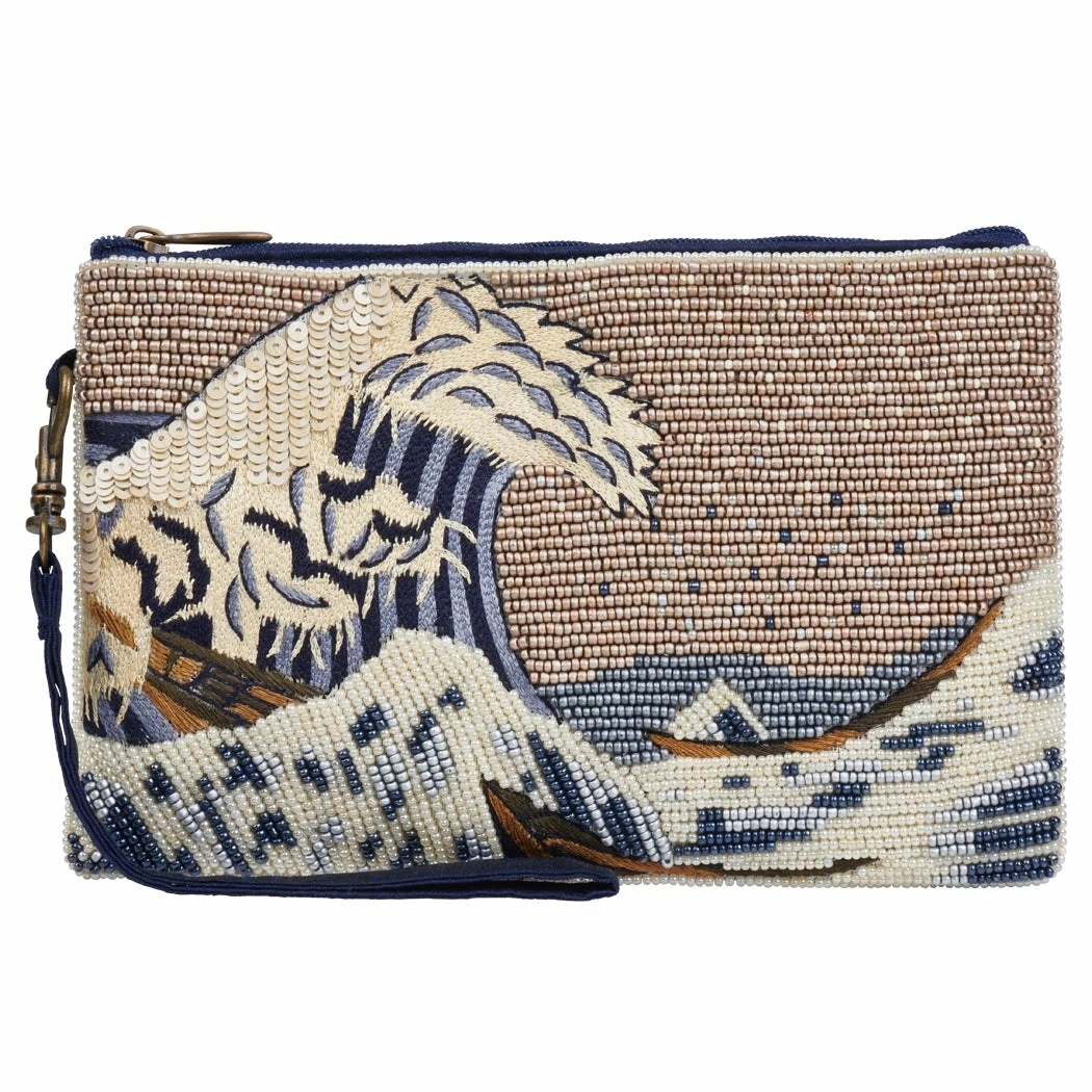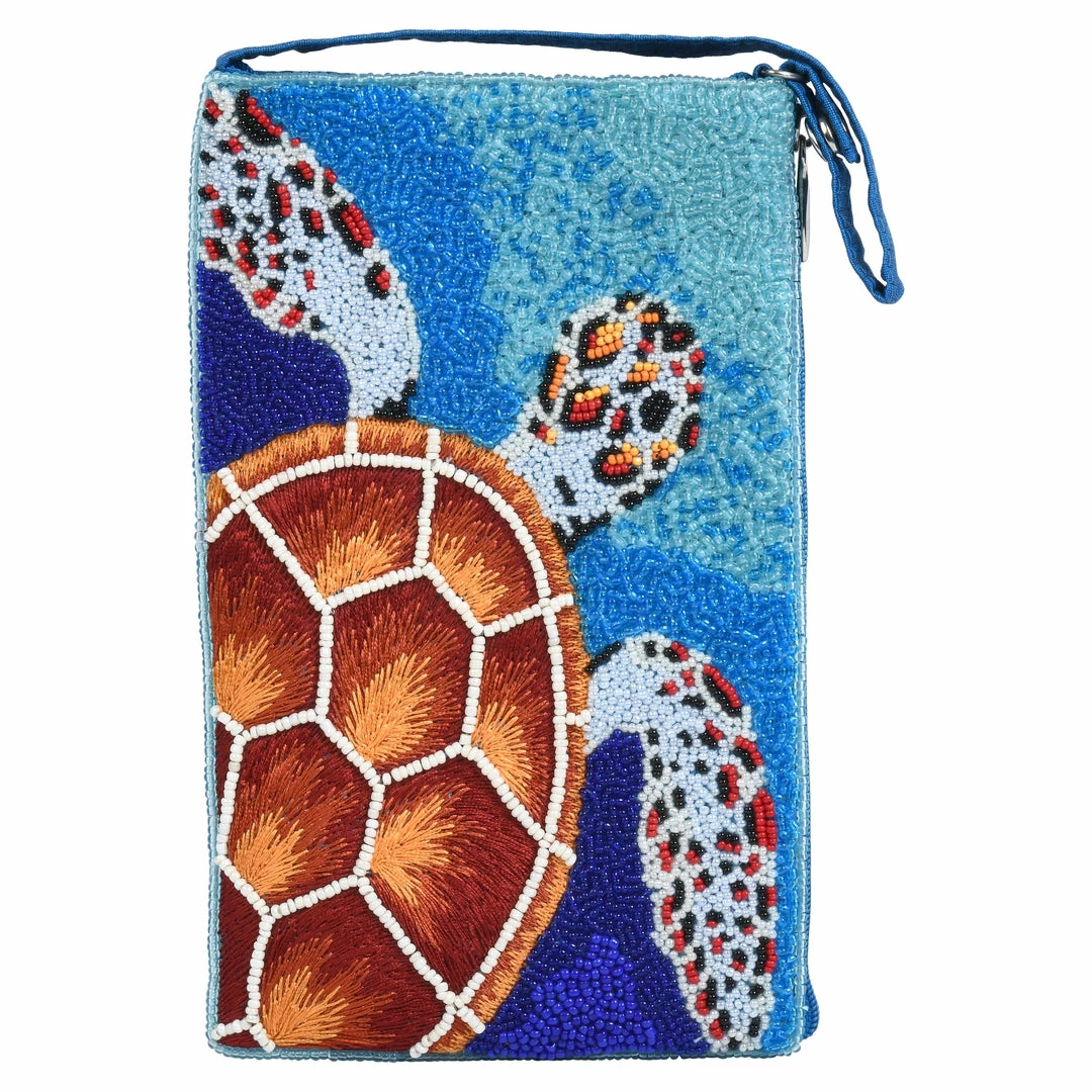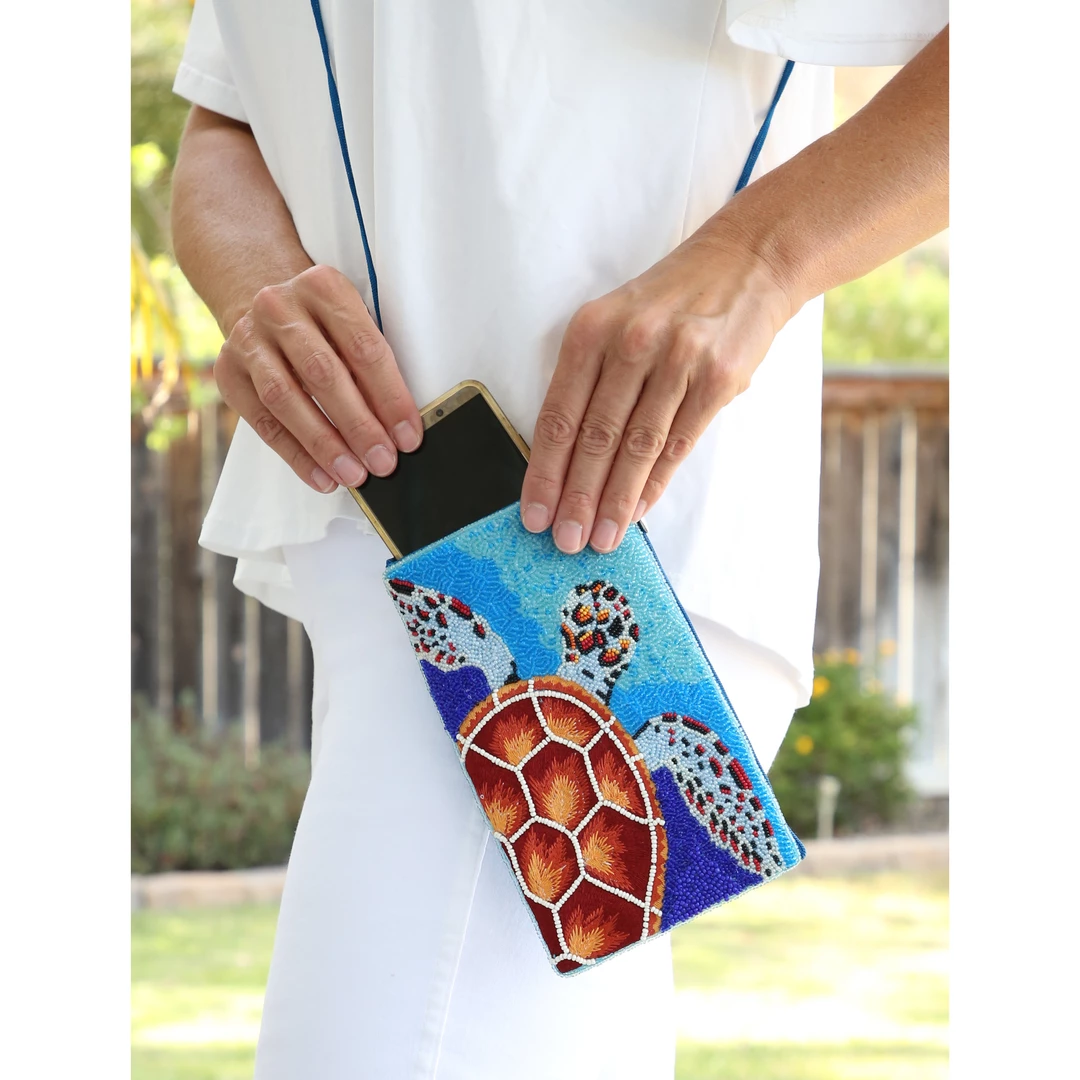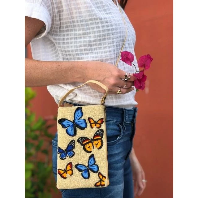 Hand beaded by artisans in India, this versatile smart phone bag can be worn cross body or as a wristlet. Includes 54″ cross body strap that can tuck inside when not in use, a short strap that unsnaps so the bag can be attached to a larger bag or belt, and a separate, secure side zip pocket for cash and credit cards.
