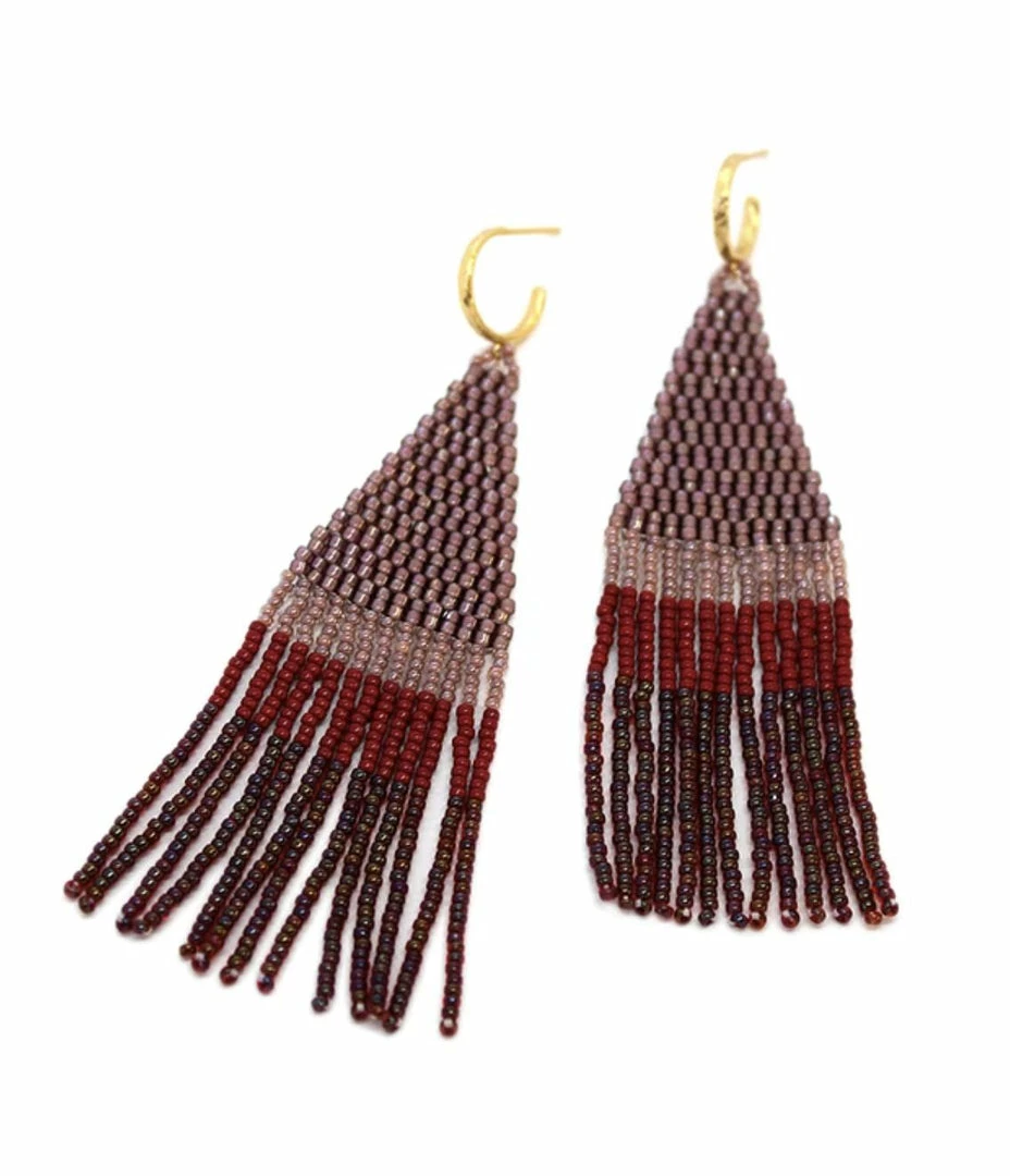 Franja is a bluma fave! This time in fall hues. Color shifts from top to bottom in a cool ombre effect with beads. Fun fringe style is set on a hug post hoop.