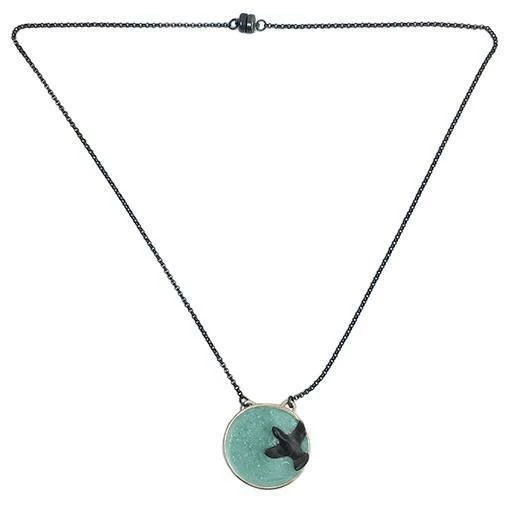 - Silhouette: oxidized silver chain with crushed blue gemstone and sterling silver pendant with oxidized bird
