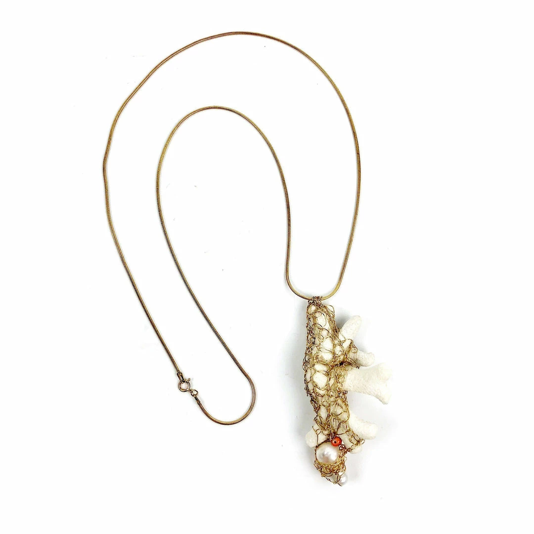 - Silhouette: white and pink coral and pearl pendants wrapped in hand-crocheted 14k gold fill wire attached to 14k gold fill snake chain