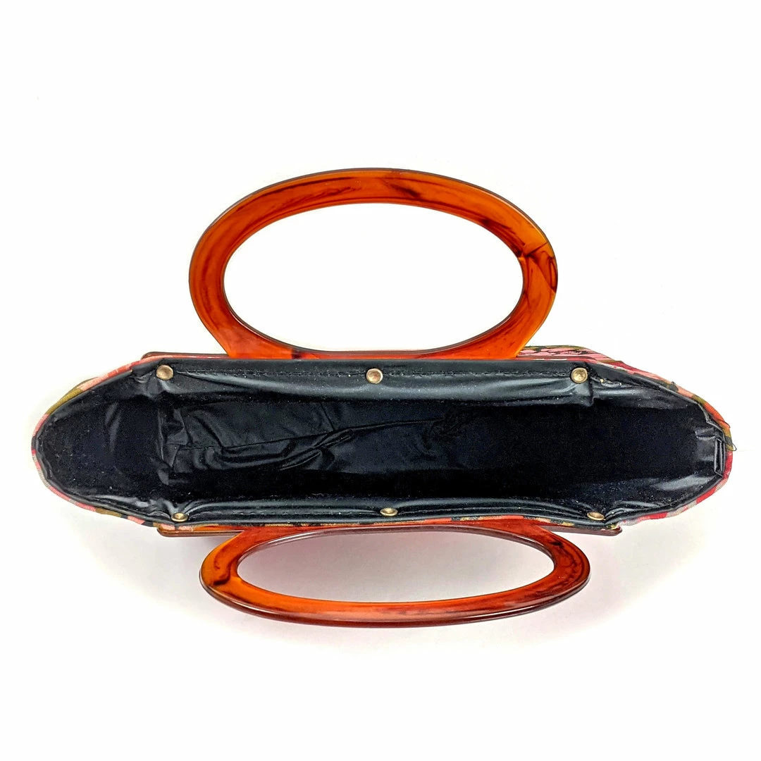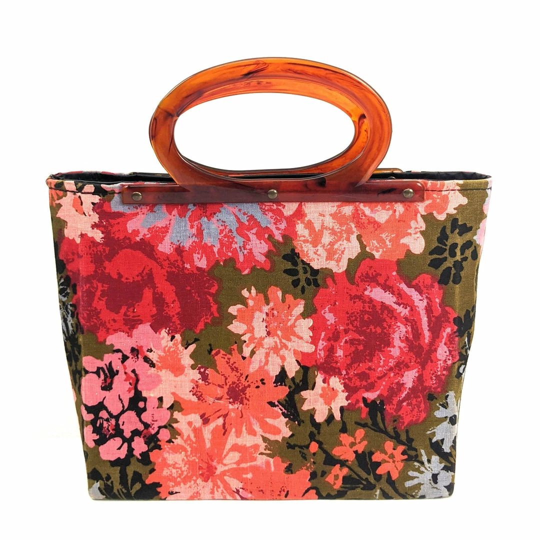 Dating from the mid to late 1960s, this cheery lightweight tote by Margaret Smith is perfect for everyday wear or casual days out & about. Festooned with flowers and topped with imitation tortoiseshell handles, this bag lets you take the magic of a spring garden with you everywhere! Its practical black vinyl lining lets you toss any and everything inside without having to worry about cleanup; plus, it’s the perfect size to hold a tablet, water bottle, large wallet, and more!