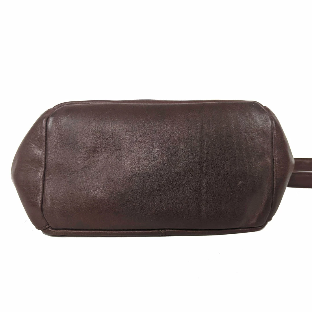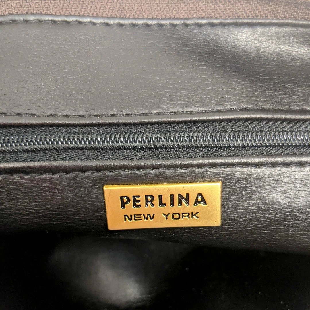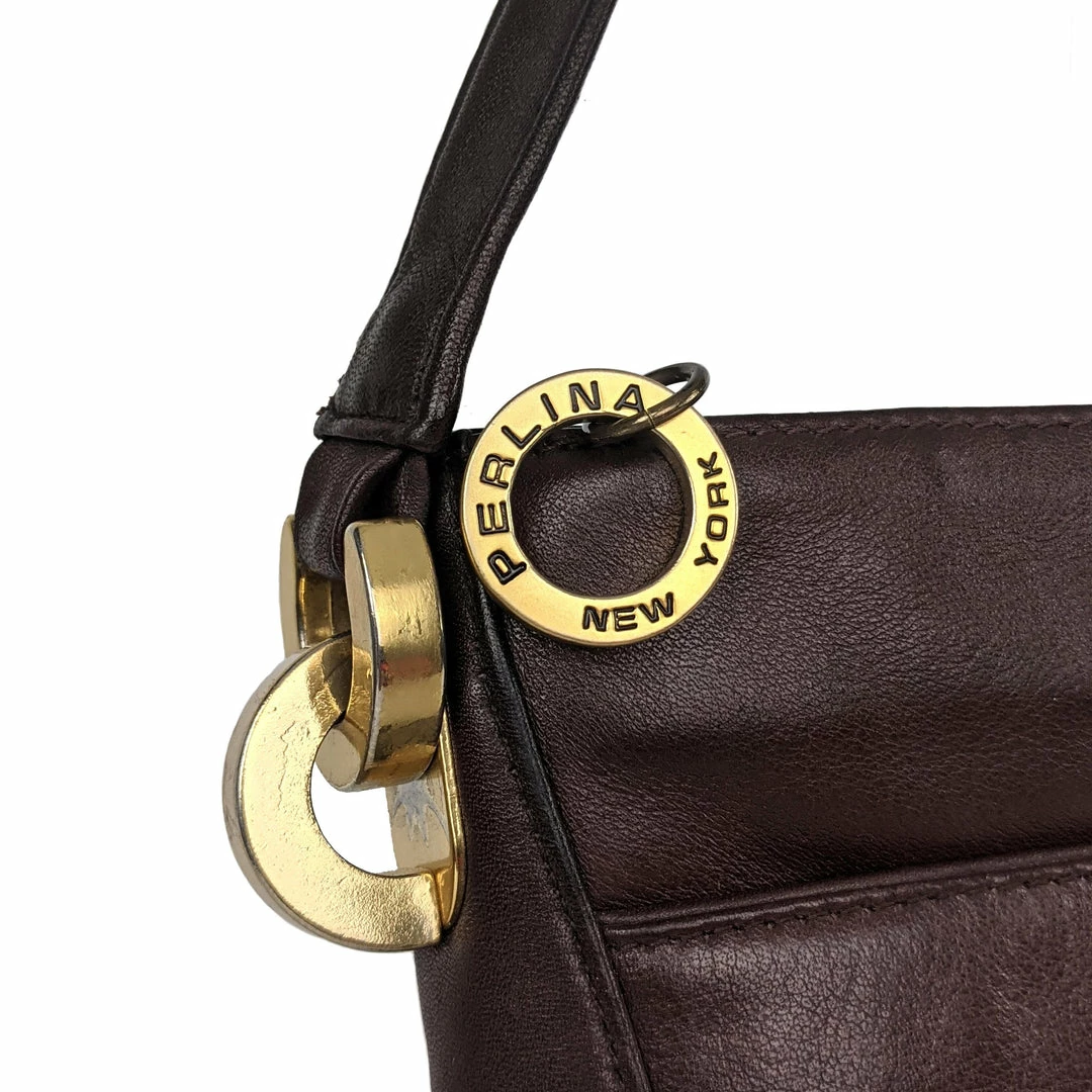 If you need a practical, classically stylish bag, look no further! Made by Perlina NYC, this shoulder bag is crafted from full-grain Italian leather and features bold, brass-plated hardware to balance out its clean lines. The hardware shows some wear and tear where pieces have rubbed up against each other, but it is not readily visible when the bag is worn. This classic is lined in black polyester, making it super easy to clean! The main zip-top compartment is accompanied by an inner zip pocket and a full length outer slip pocket.