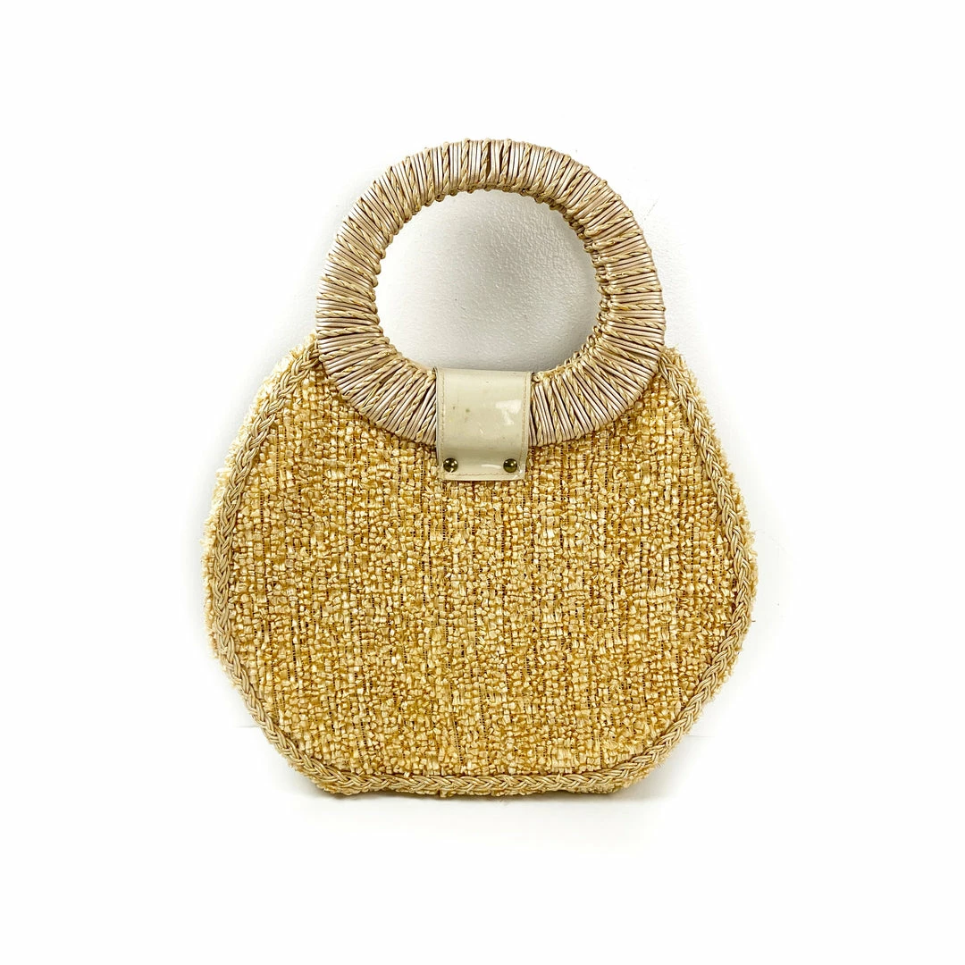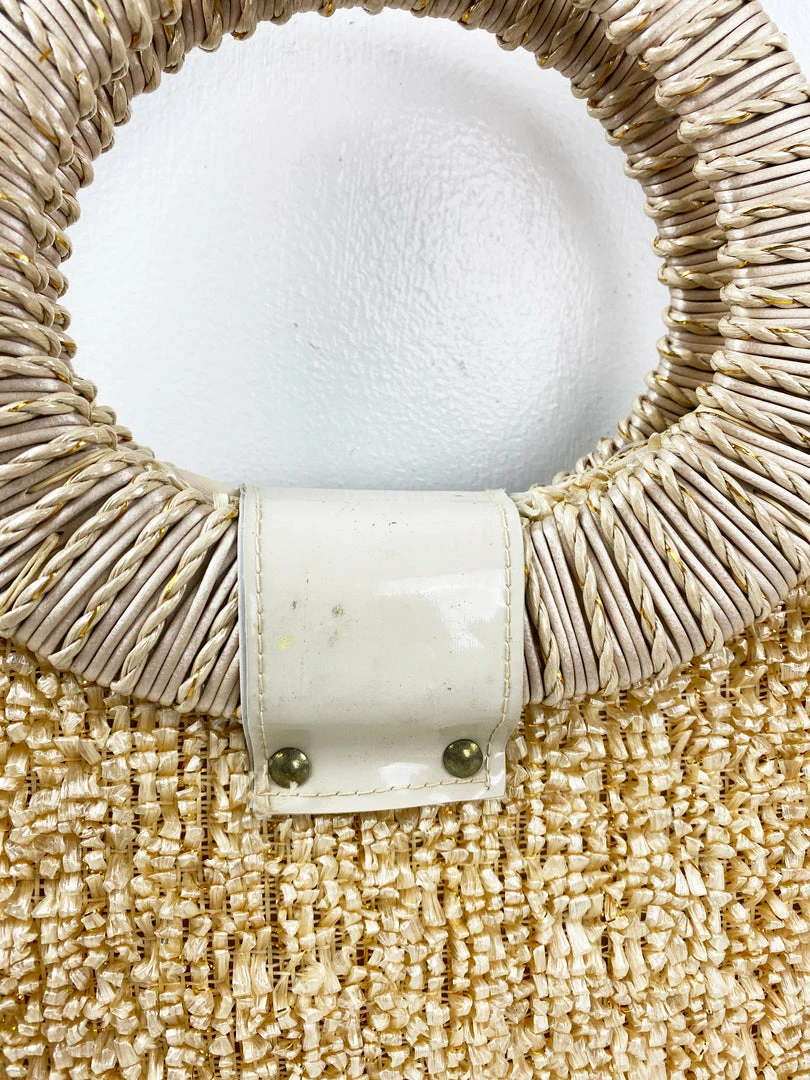 Made in Japan, this swinging sixties handbag is perfect for summer and even into fall! The structured handbag features beading and floral applique with velvet-like leaves adorned with faux jewels. The woven exterior of the bag contains gold shimmer throughout, making this a stunner from every angle. The patent leather top strap features a turn lock for securing the interior. (Note that there a couple of minor scratches on this portion of the bag.) The interior is large enough for your wallet, phone, keys and other essentials as well as a slip pocket for additional interior storage. The structure of this vintage bag allows it to stand on its own, so nestle it next to you on a day by the beach or adventures near and far!