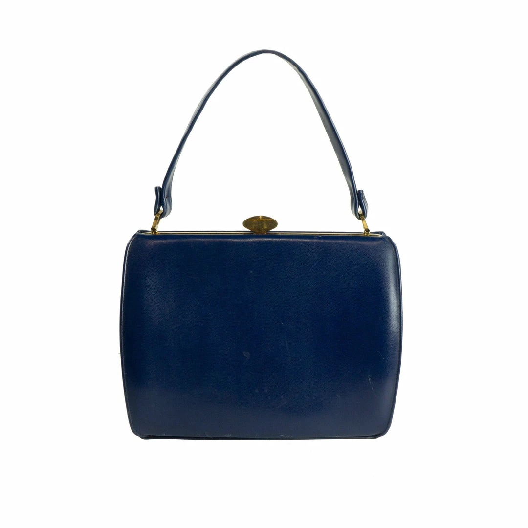 Mamselle Original New York- Made by Mam’selle, this 1960’s navy leather handbag is in good vintage condition. A few light, tiny scratches on the exterior, but otherwise the exterior is in great condition. The interior is a sateen fabric with minor signs of wear. Two large slip pockets and a zippered pocket AND the original mirror inside. A gold-tone frame and closure accent this sleek handbag. Plenty of room for your sunglasses, phone, wallet and other essentials.