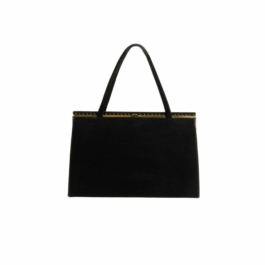 Circa 1960’s, this small black suede bag has a gold-tone frame with rivet details along the top, front and back. The interior is lined with black satin, and features both a zippered pocket and slip pockets. Its sleek shape and refined details make this bag especially flexible between day and evening wear. With no flaws to note, this bag is in pristine vintage condition!