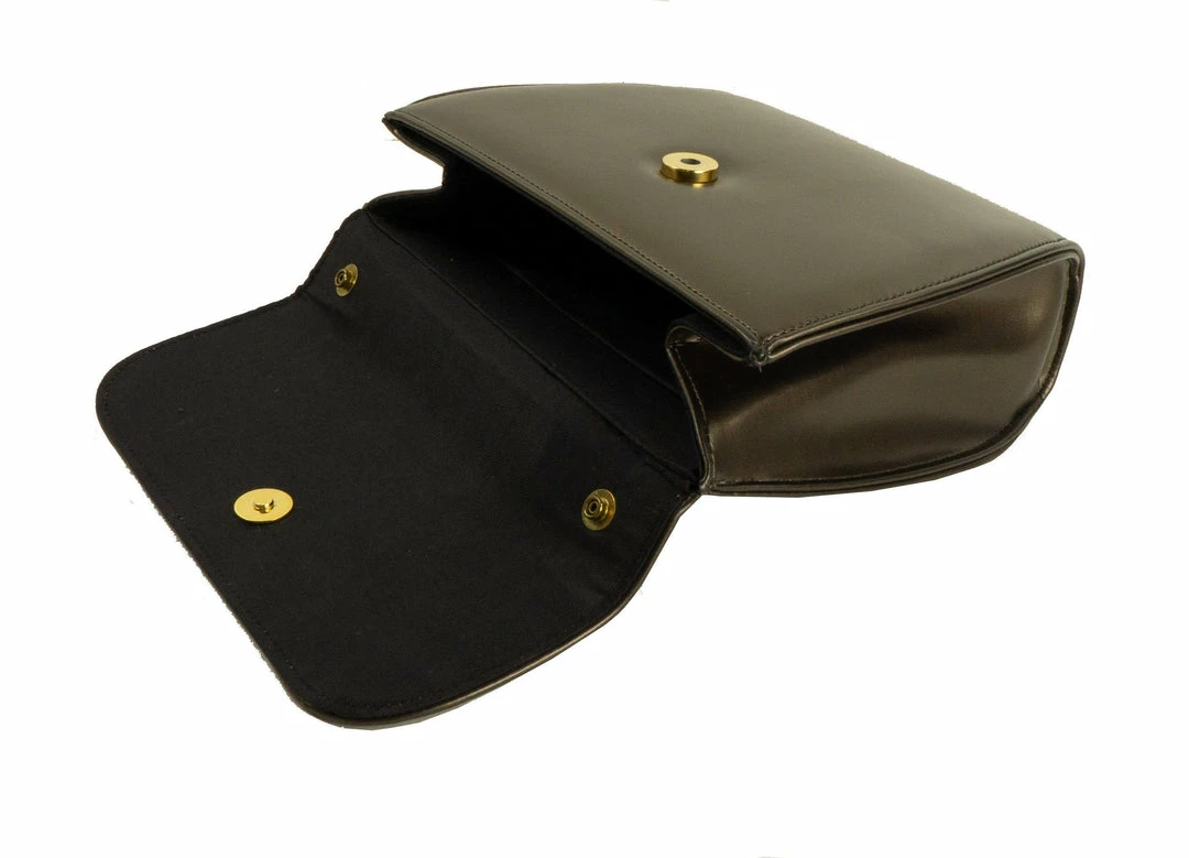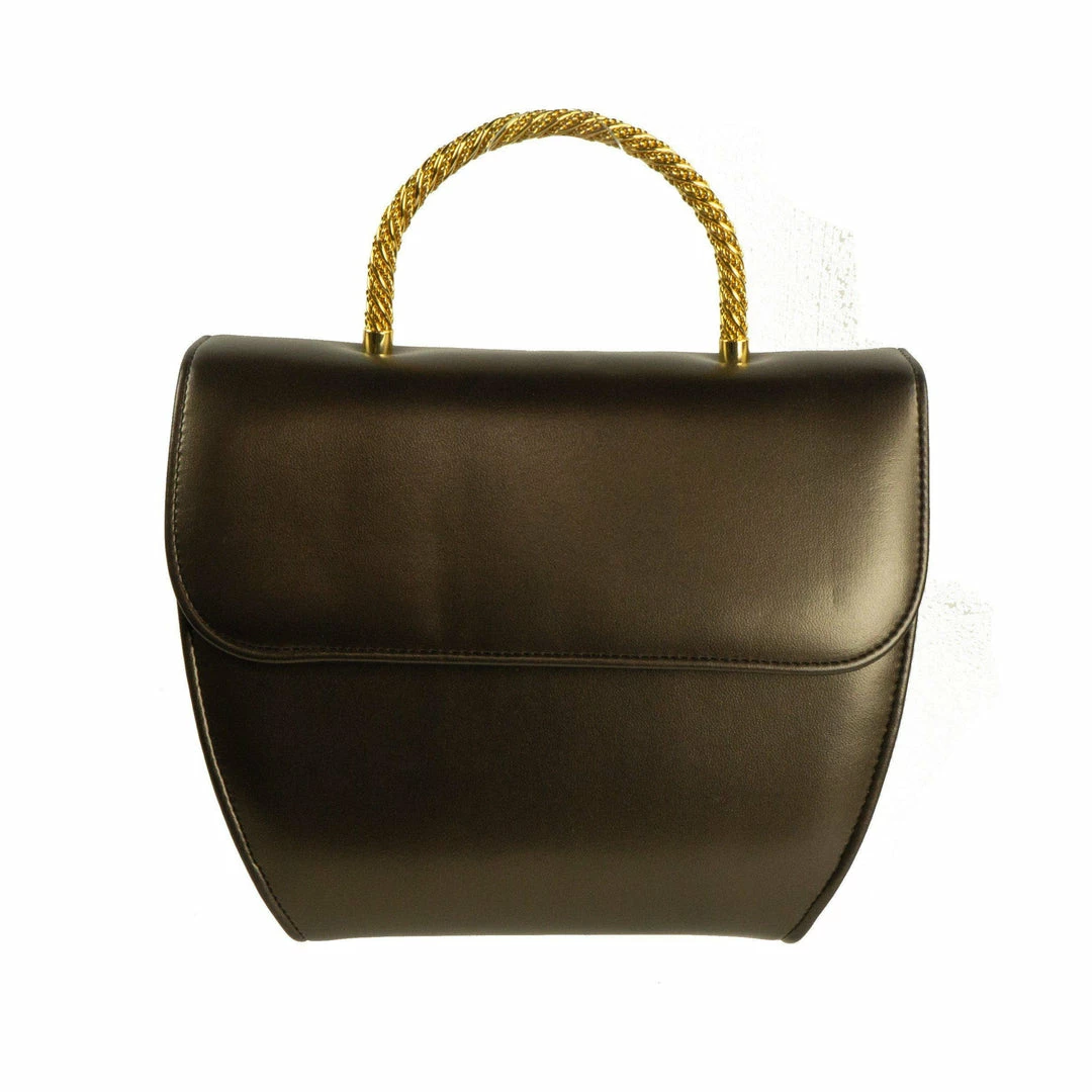 Circa 1980’s, this uniquely-shaped faux leather chocolate handbag is perfect for casual days or sophisticated evenings. With a slight sheen in the exterior, this petite handbag is sure to standout. A glimmering gold-toned handle is the crown this bag deserves! The interior is fully lined and spacious with plenty of room for your phone, wallet, sunglasses and more, complete with a slip pocket for additional storage. Two tiny indentions on the back exterior and one thin indention along the flap are the only flaws to this otherwise fabulous vintage condition handbag.