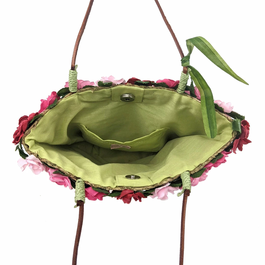 This ’90s cutie is made from natural straw and trimmed with fabric flowers. Its real leather handles are adorned with a tie-on fabric leaf detail. Lined in lime green cotton, with one inner slip pocket, this adorable day bag is ready to be your springtime companion!