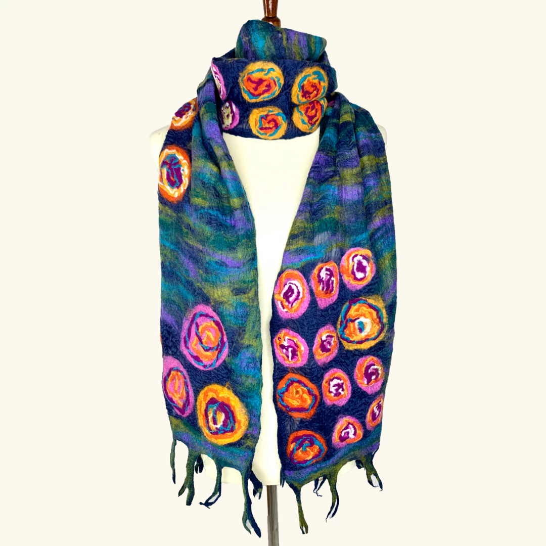 Inspired by Monet’s Water Lilies painting, this Merino wool & silk chiffon scarf is full of color, art, and texture.