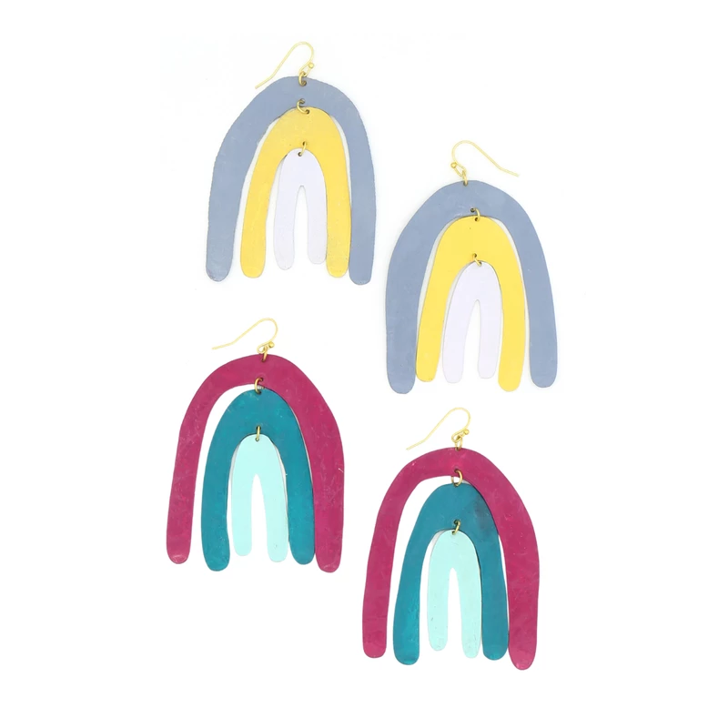 The fun colors are sure to stand out! The perfect pair of earrings for someone who loves to play around with bold jewelry. Organically-shaped, these painted upcycled brass earrings are a medium weight rainbow earrings.