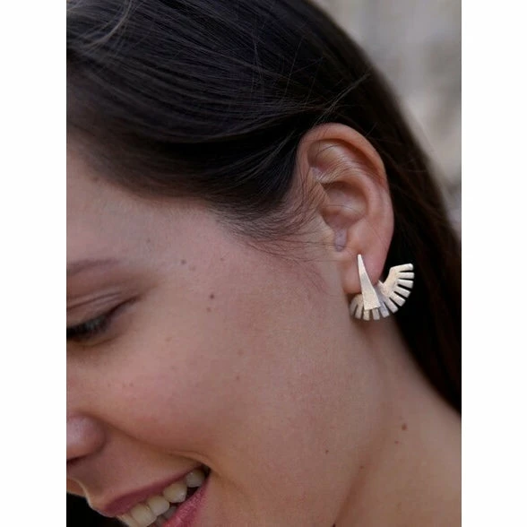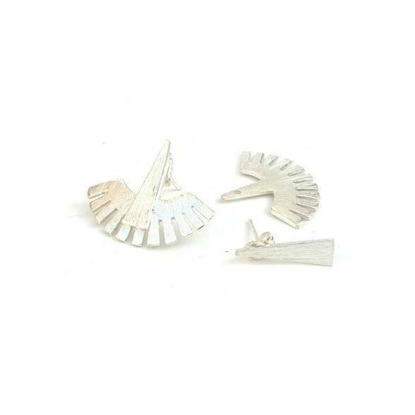 Ear jackets are comprised of three parts, designed for you to wear the larger ”peacock” part in back, and the spade stud part of the earring in the front of your ear. Made from recycled metals: brass base metal plated with silver. Measure 2.2cm by 3cm. Handmade by women in India.