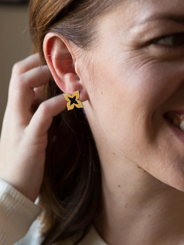 This brass earring has a black painted center to create an elegant blossom stud. These small flower studs are perfect for those that love nature inspired jewelry, but on the dainty side.