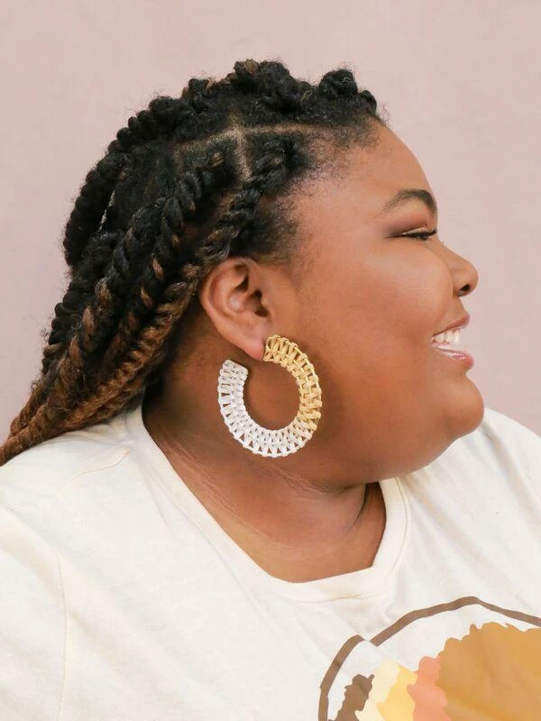 These earrings make a statement! Oversized hoops with a simple color block pattern. The white and tan hoops are made with woven natural fiber for a bold earring that is the perfect neutral color to match all your favorite outfits.