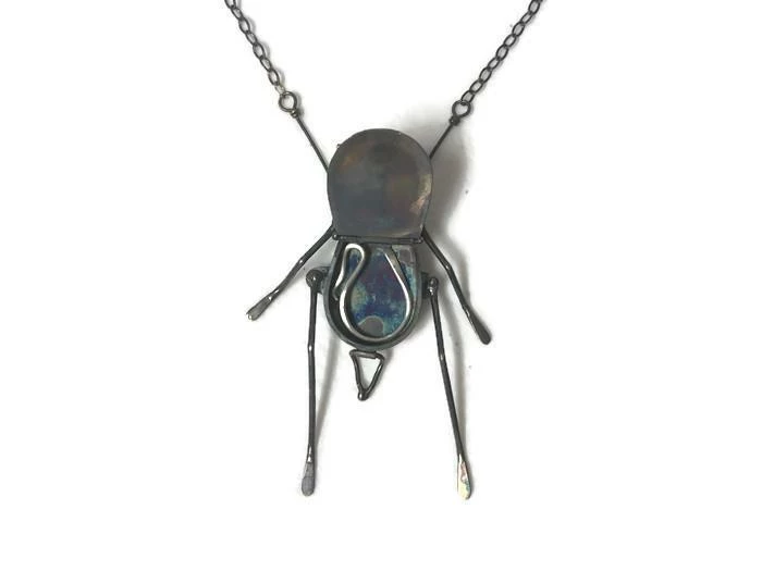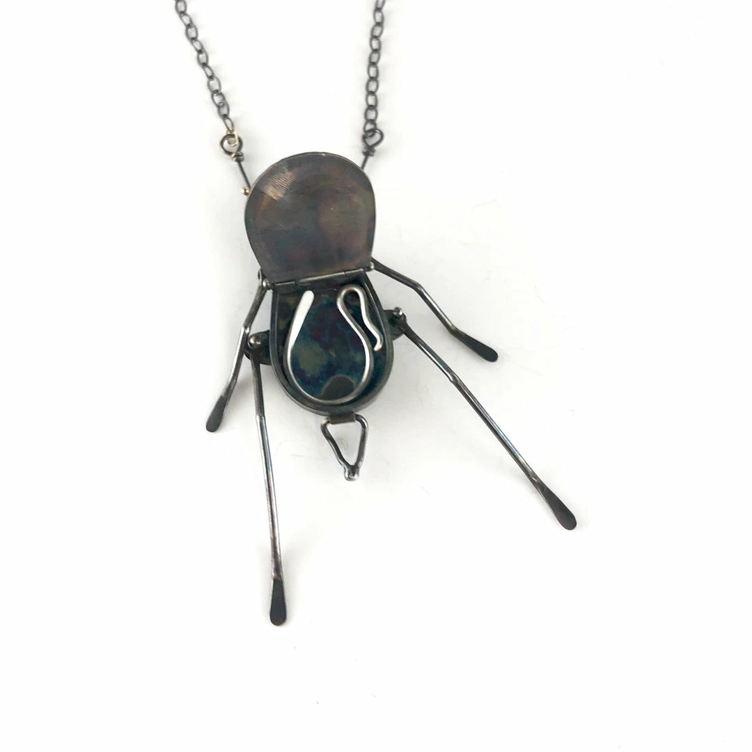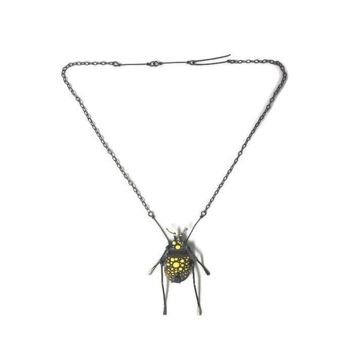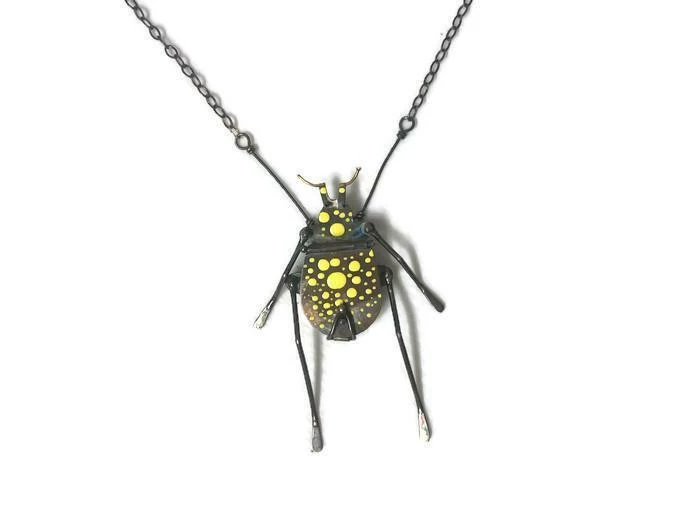 And the beet-le goes on! This unique yellow Dapple Lemon Beetle is for those who love something quirky. Comprised of sterling silver, the Lemon Beetle pendant not only has depth in design but also structure as the legs move freely on either side of the bug’s body. Yellow enamel dots pop off the oxidized silver, 14kt Gold antennae delicately protrude from the beetle’s crown while the lower body hold a surprise! Simply lift the shell to fit a sterling silver worm nestled snuggly inside! Gould’s designs are inspired by the southern coastal landscape as well as ornamentation of indigenous peoples.