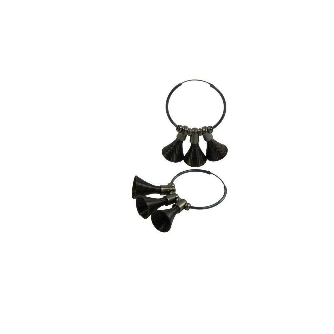 Playful, funky and airy, these sterling silver earrings make a modern statement. Blackened stainless steel cones decorate the silver hoops and the cones’ movement makes them even more eye-catching.