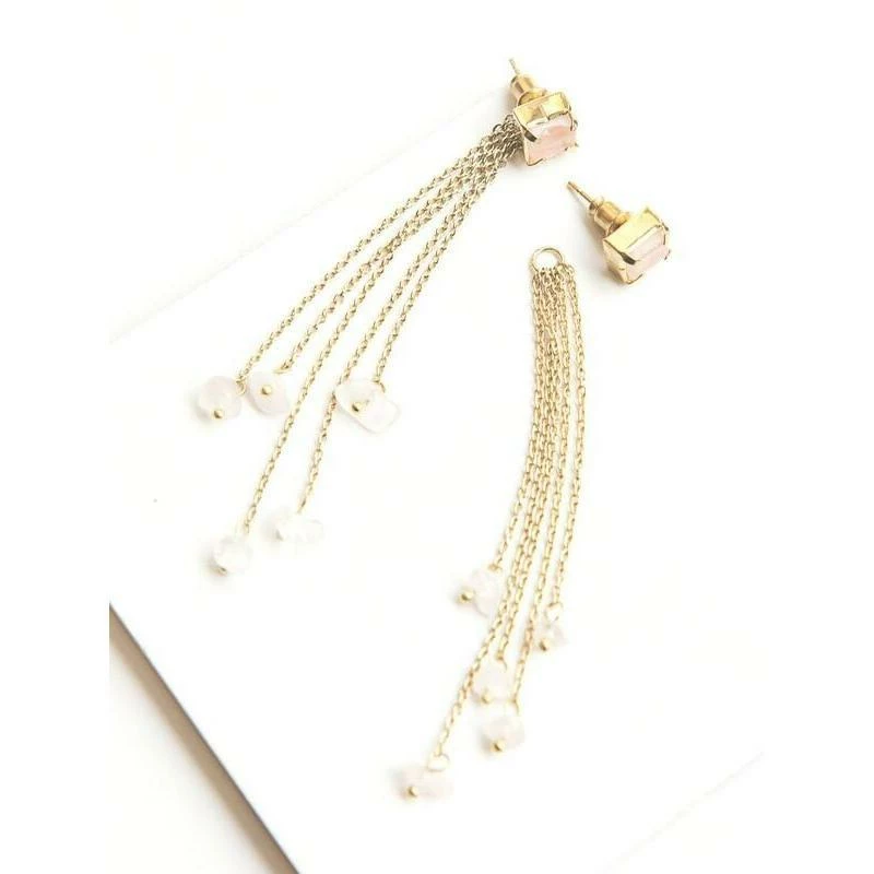 Talk about versatility! These ethically-made rose quartz ear jackets can be worn 3 different ways: with the eye-catching dangle in front, with the stud in the front and dangle in the back, or even as little pink studs.