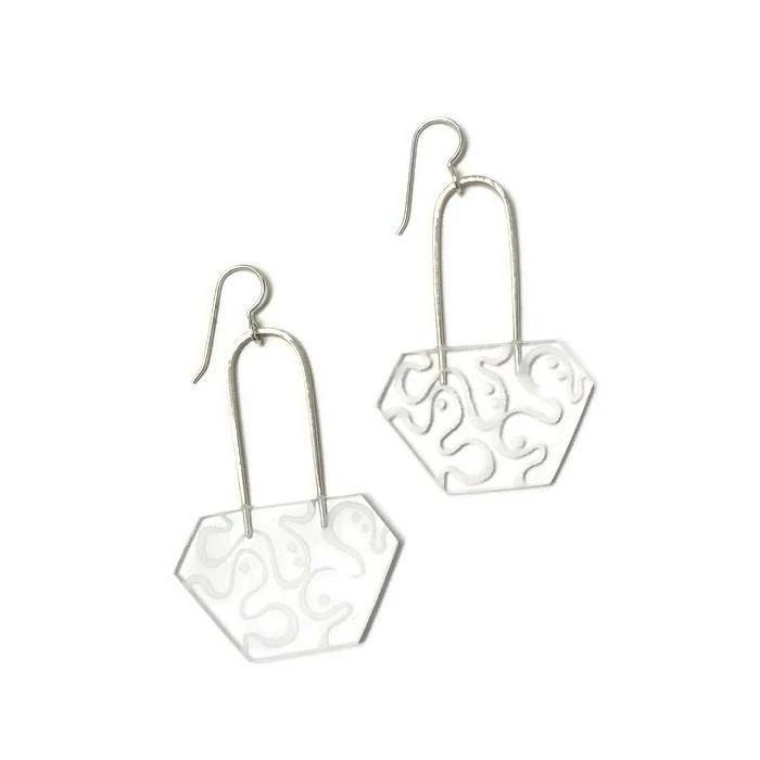 Sterling silver is artisticly paired with etched plastic to create a minimal yet detailed piece sure to compliment you! The sterling silver fastenings create an architectural element for these unique earrings accentuated by the whimsical etched plastic design. The geometric shape of the etched plastic accent resembles a handbag, so you KNOW we love them!