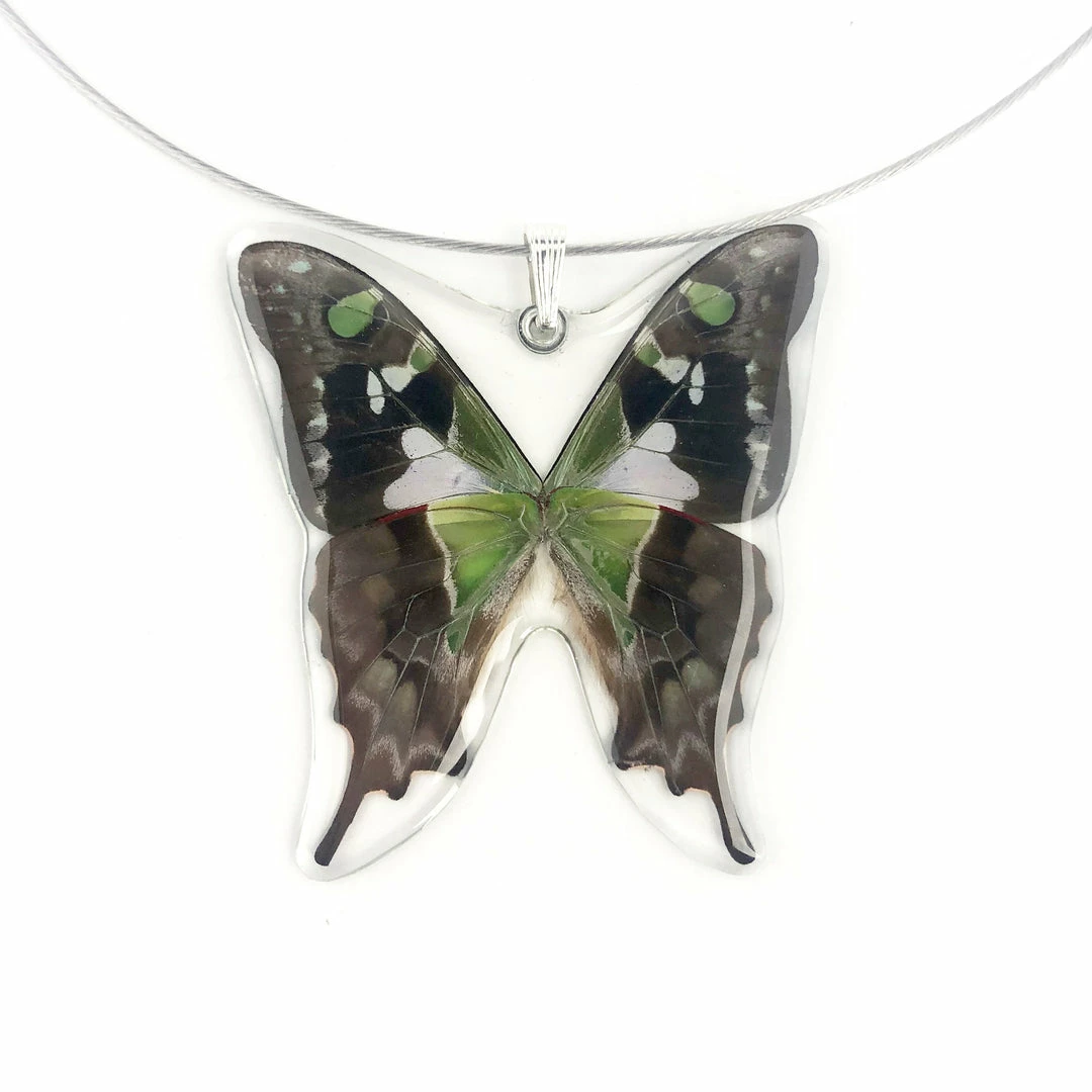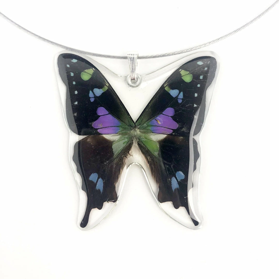 Real whole butterfly pendant on a sterling silver bail, encased in resin using a proprietary process. Reversible!