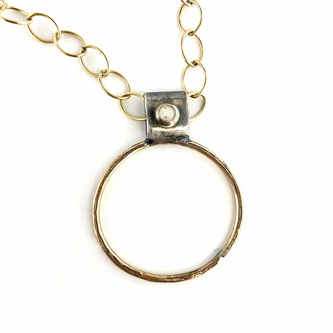 The closer you look at the sleek, circular pendant, the more the delicate designs come to life! Displaying a pearly, opalescent shimmer, the Moonstone in this Silver and Sage necklace adds a touch of glam, making the Hoop Necklace versatile for day and night looks. Silver and Sage jewelry is crafted with your own journey of self-discovery in mind. Symbolism and authenticity are at the heart of each crafted piece. For those looking for a versatile yet unique piece, this necklace is for you!