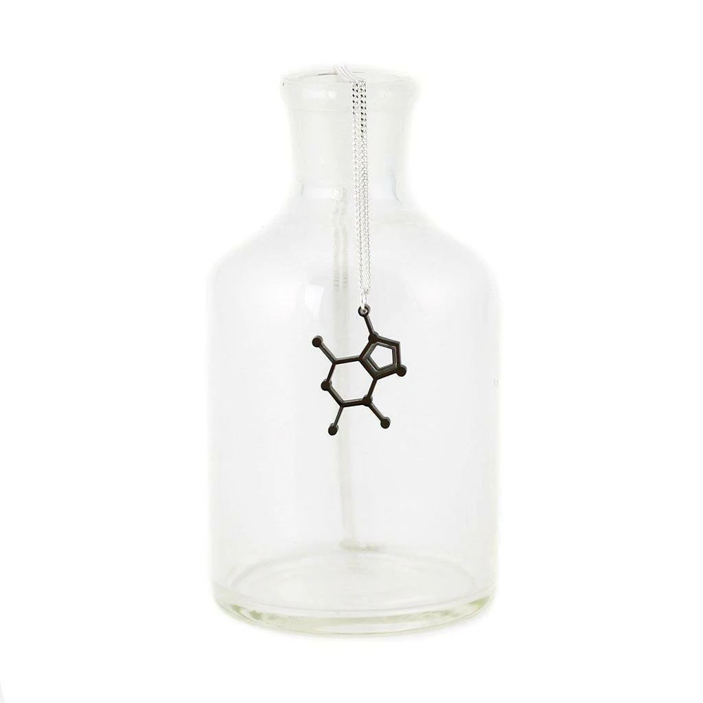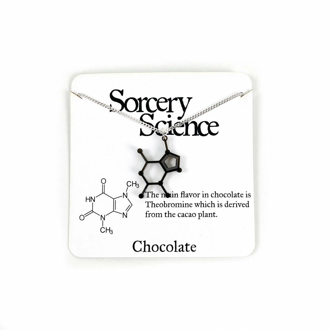 These earrings are based on the molecular structure of the main flavor compound in chocolate, theobromine. The name theobromine roughly translates from Greek, as “food of the gods” and these earrings are a no-calorie way to enjoy chocolate. Eating chocolate can increase your serotonin and dopamine production, making you feel happier.