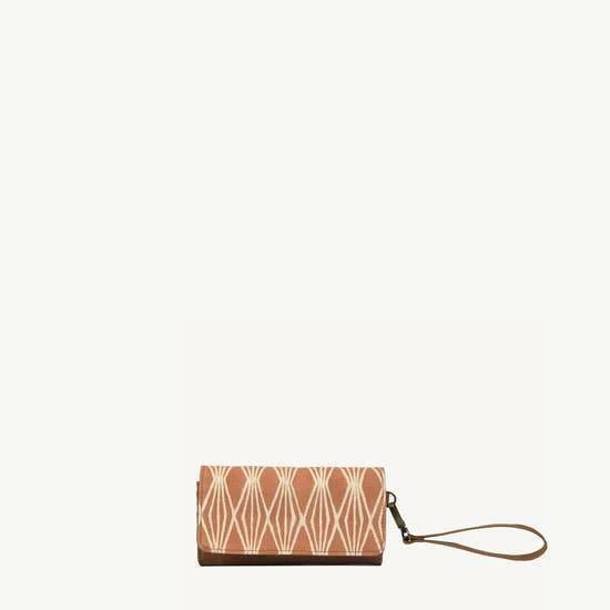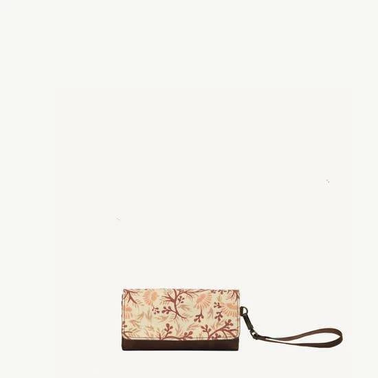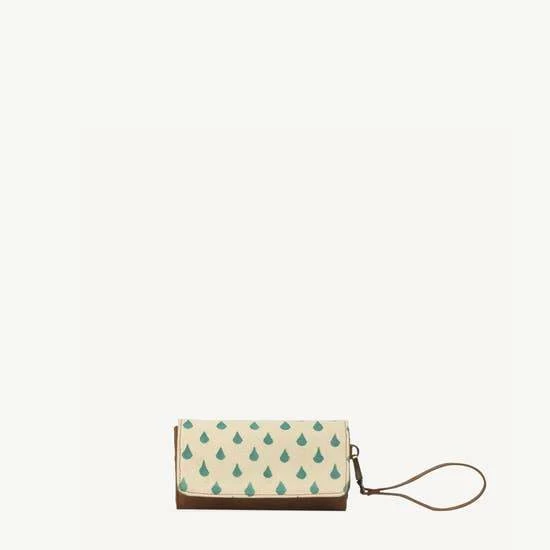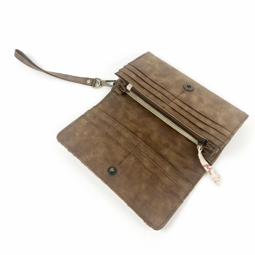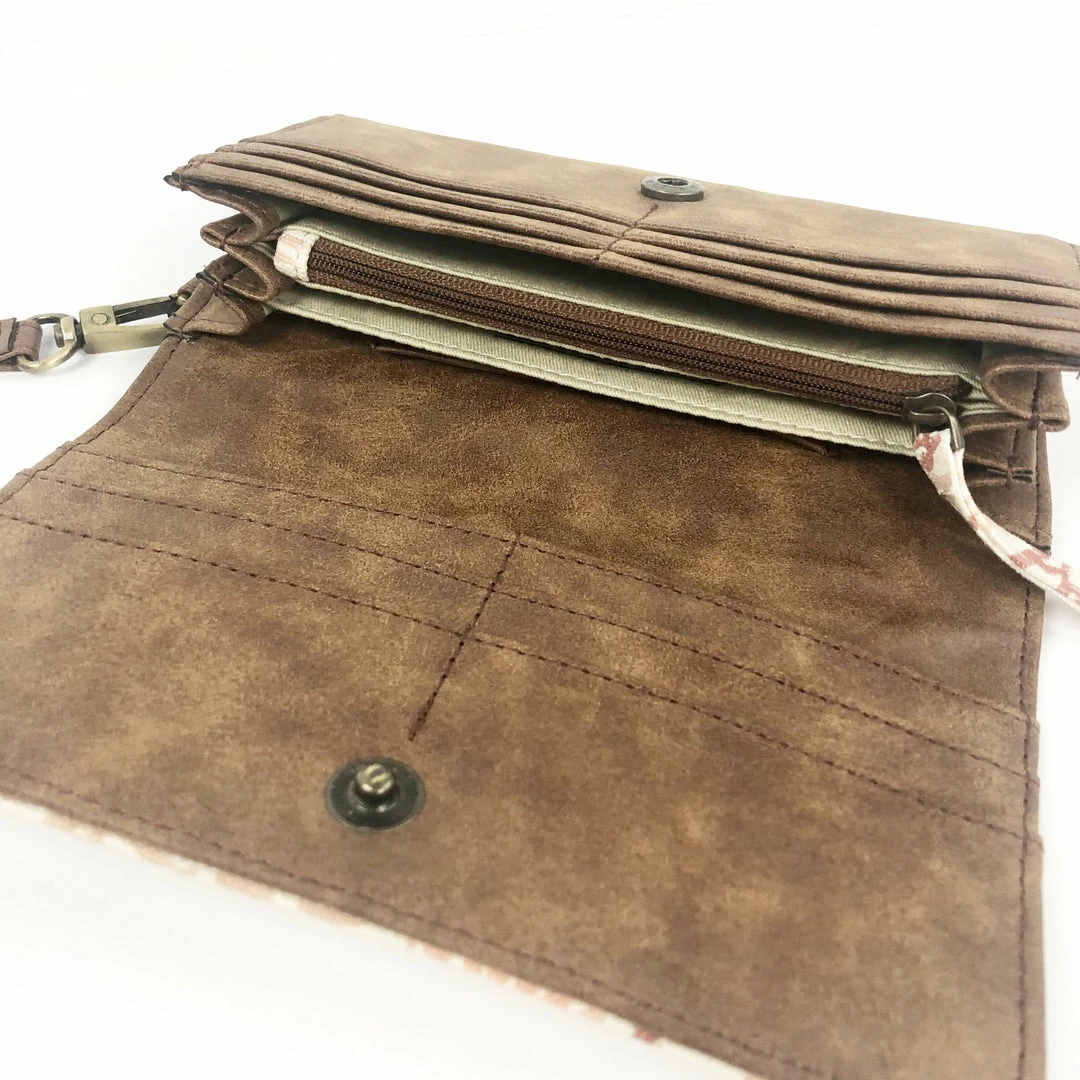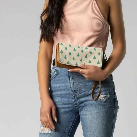 Features: Hand spun, hand woven and hand block-printed cotton fabric with a vegan leather body. Magnetic button closure. Interior partitions to hold cards and currency. Includes 10 card slots, 1 ID window slot, 1 interior zipper pocket, 3 partitions, and 1 exterior zipper pocket. Detachable vegan leather wristlet.