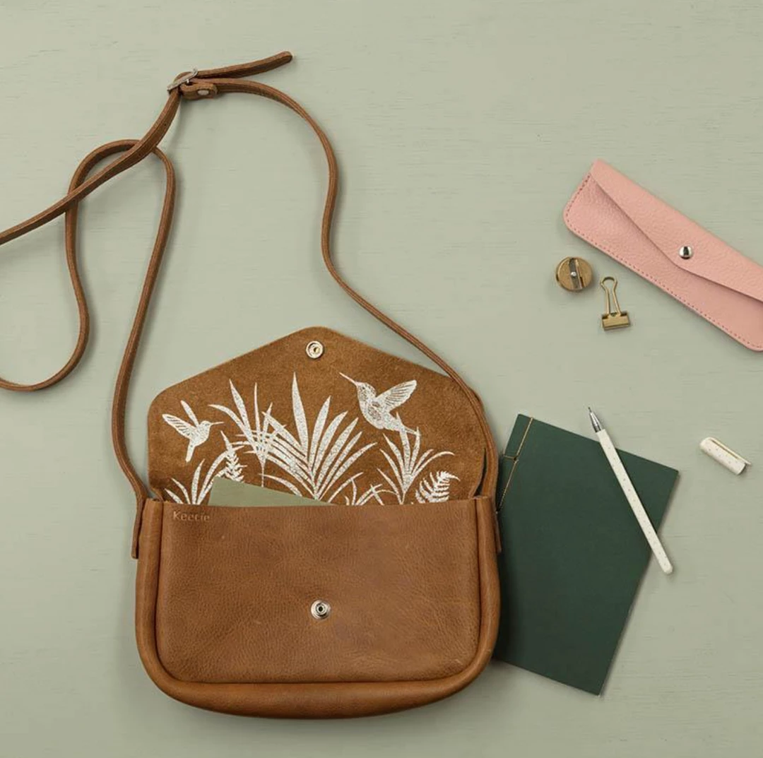 Your favorite new leather shoulder bag is big enough for all your daily essentials. With a tropical silkscreen print on the inside to brighten your day.