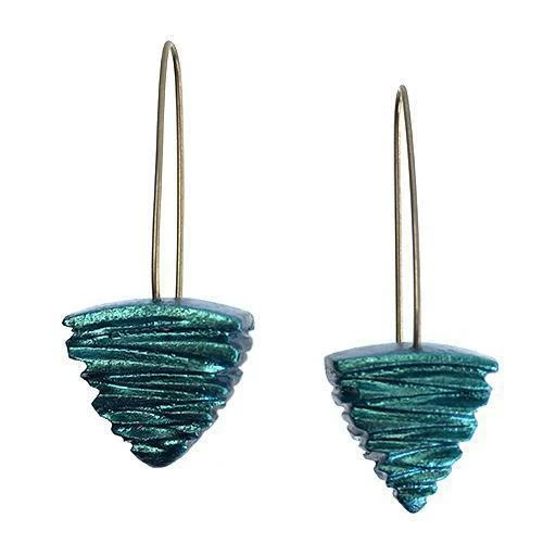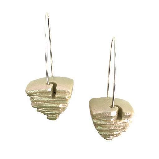 - Silhouette: hand-carved pyramids with grooved, textured finish dangled from ear hooks