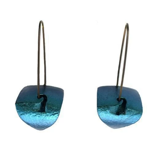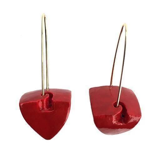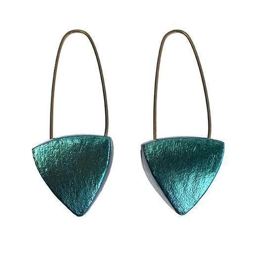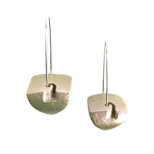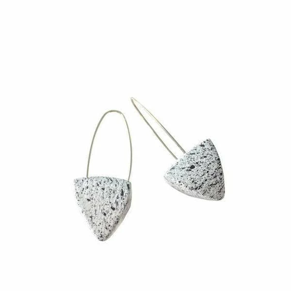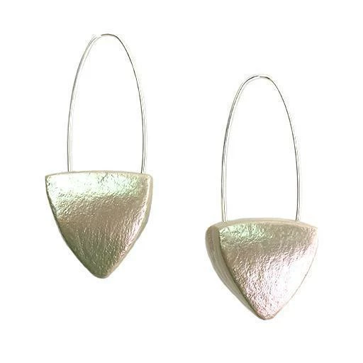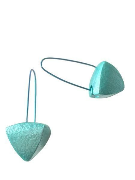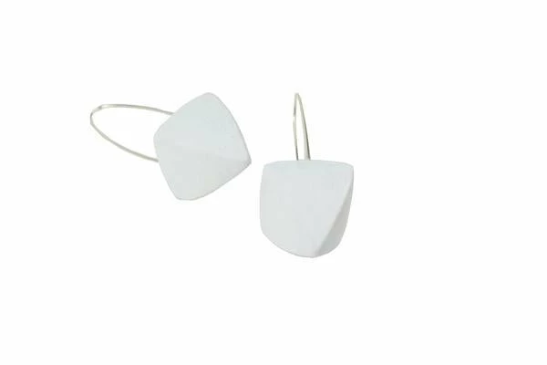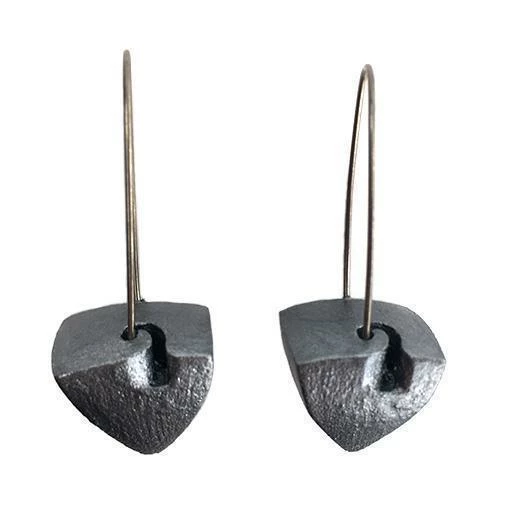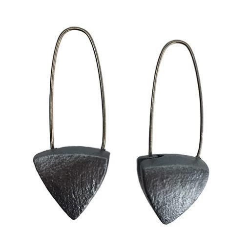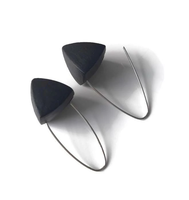 - Silhouette: hand-carved pyramids with grooved, textured finish dangled from ear hooks