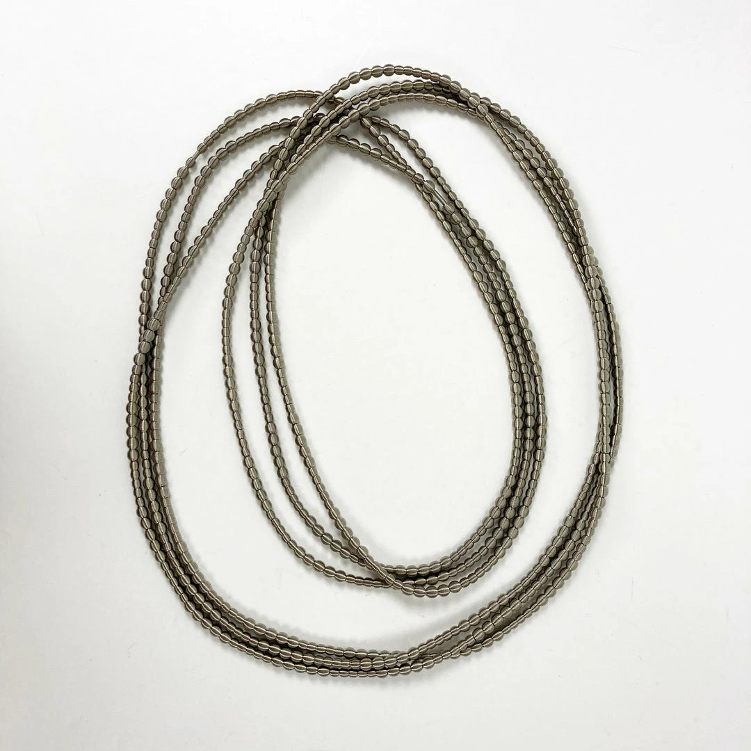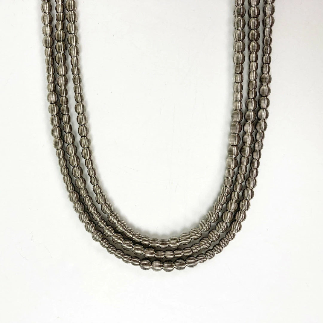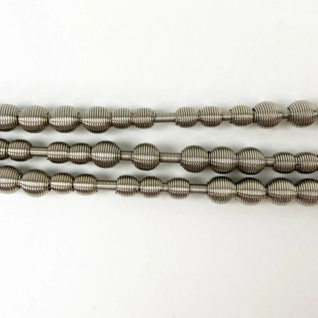Three strands of undulating springs makes for an interesting statement piece that can be worn so many ways.
