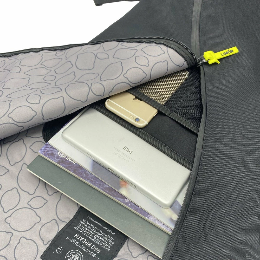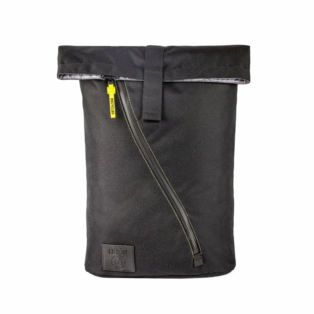 Exterior and Interior fabric made of 85% Recycled PET Bottles certified by GRS PU badge made of recycled PU zippers are made of recycled materials