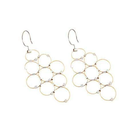 - Silhouette: loosely linked gold circles with sterling silver accents mounted on ear hooks