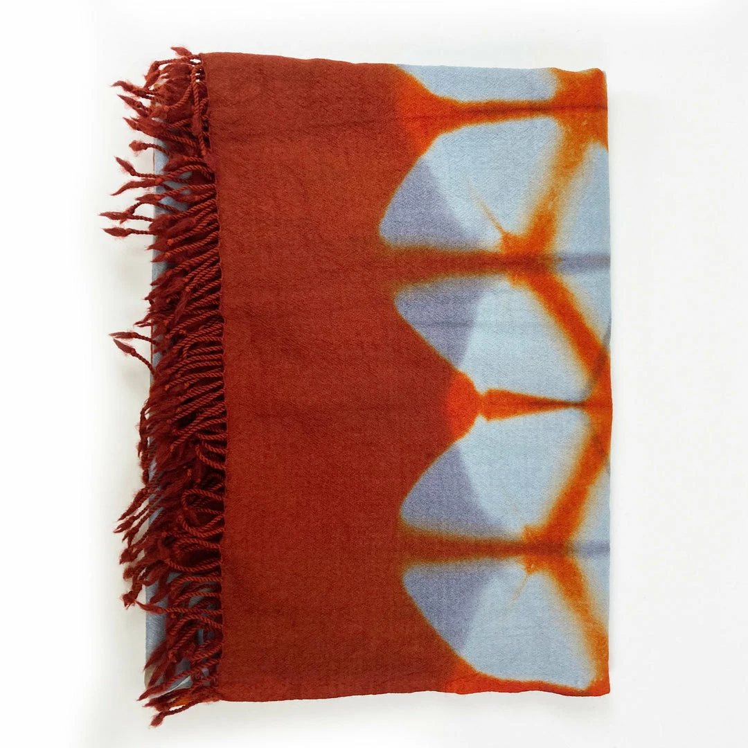 orange and blue scarf is 100 %wool and dyed in a unique geometric pattern with twisted tassels on the edges
