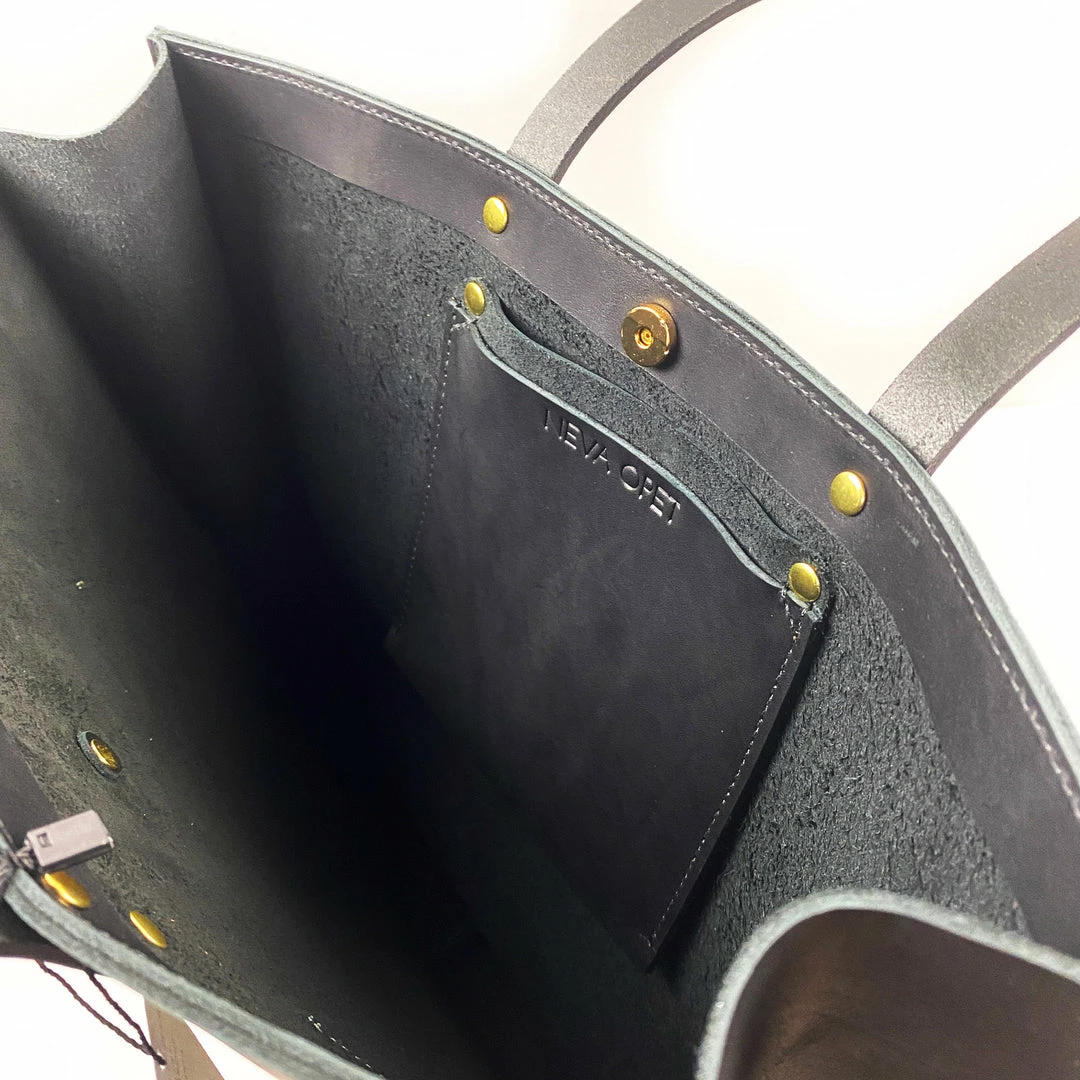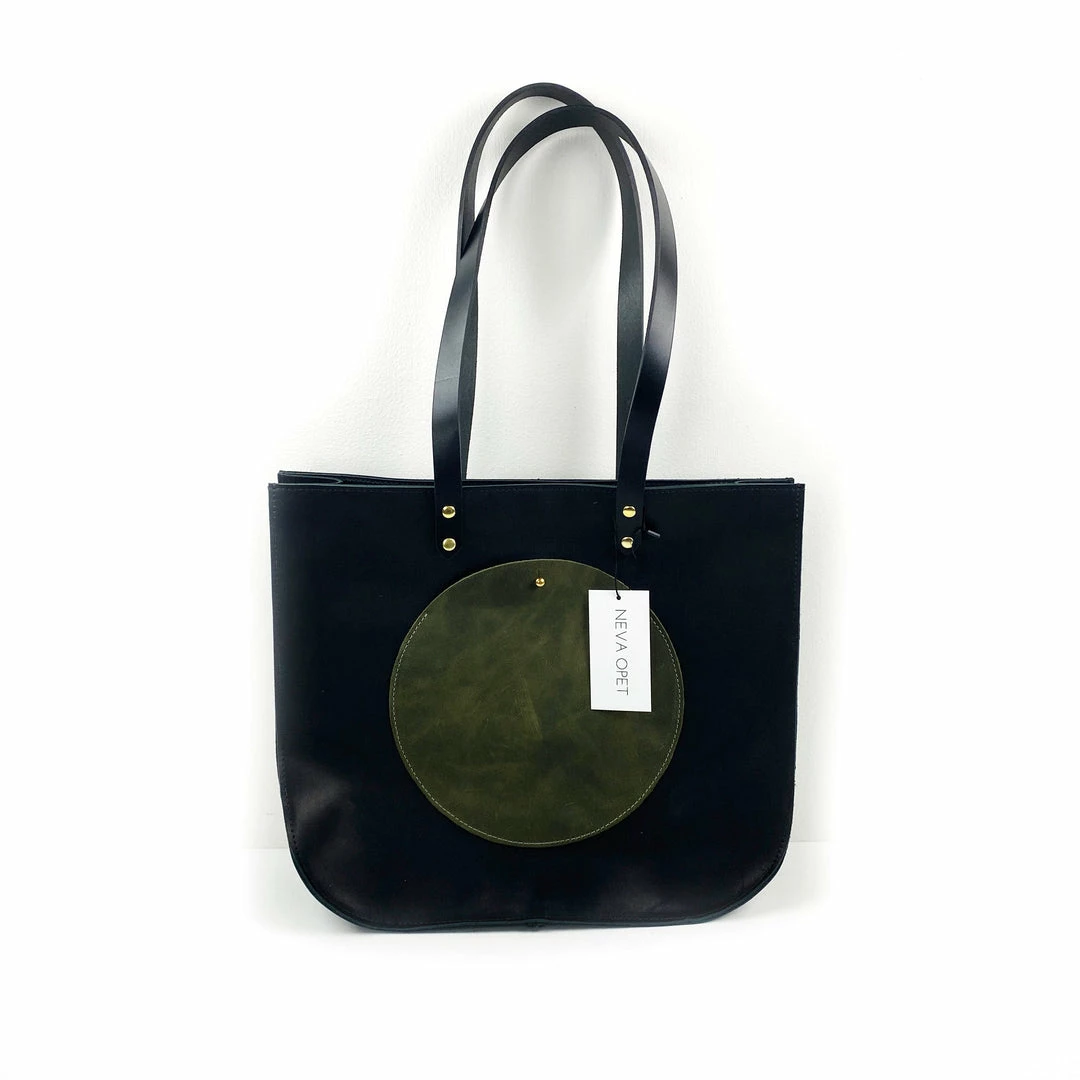With the combination of rich black and cocoa oil hide leather (water and stain resistant), the Isabel handbag can go anywhere, securing essentials like a laptop, tablet, and other items inside. Due to its minimal yet luxe design and craftsmanship, this roomy tote works in any season and as the leather ages your bag grows in character all its own. Brass hardware offsets the rich leathers beautifully, adding small though impactful metal detail to the Isabel Tote. With an interior slip pocket and exterior circular pocket with snap closure, you’ll stay organized and your items will remain accessible throughout the day.