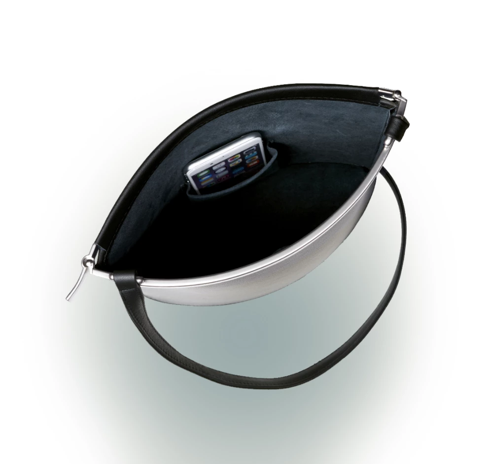 Arcade, Shoulder bag. One of the most sought after Olbrish Bags. Arcade protects your valuables in an ingenious manner. The spring steel fastener opens the bag on the side next to your body and therefore is security protection and eye-catcher in one.