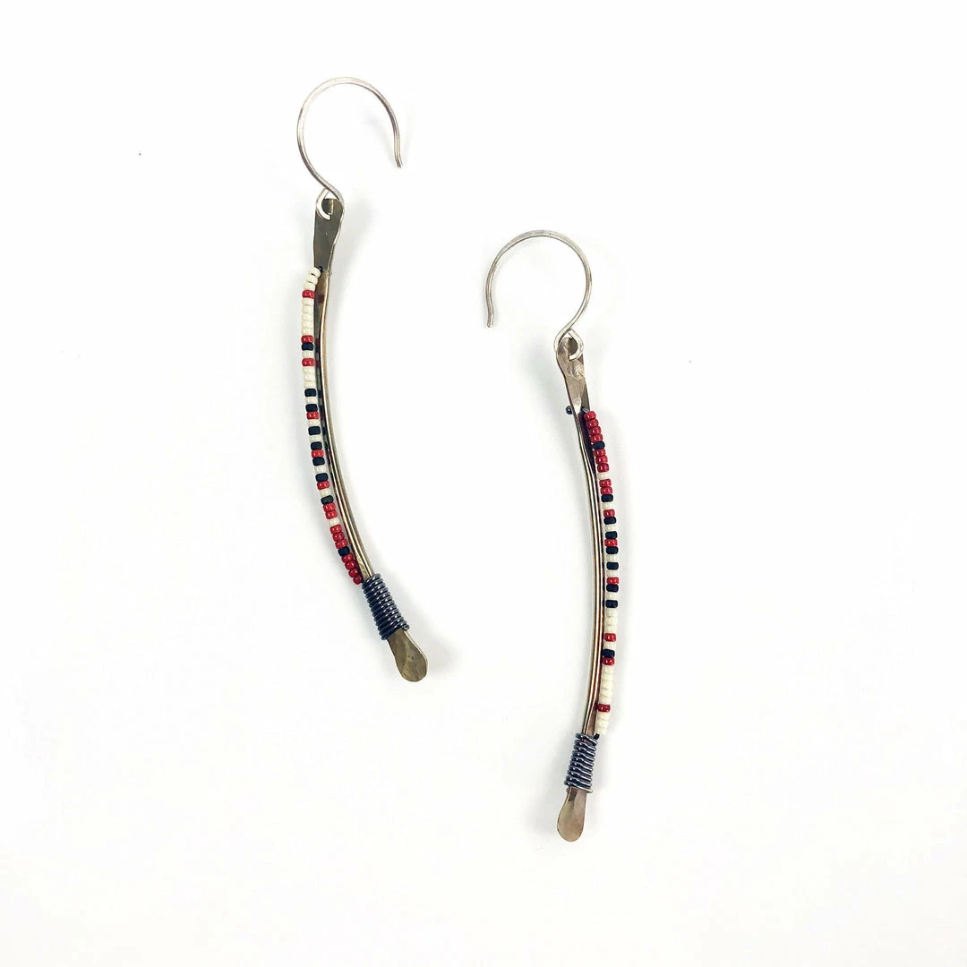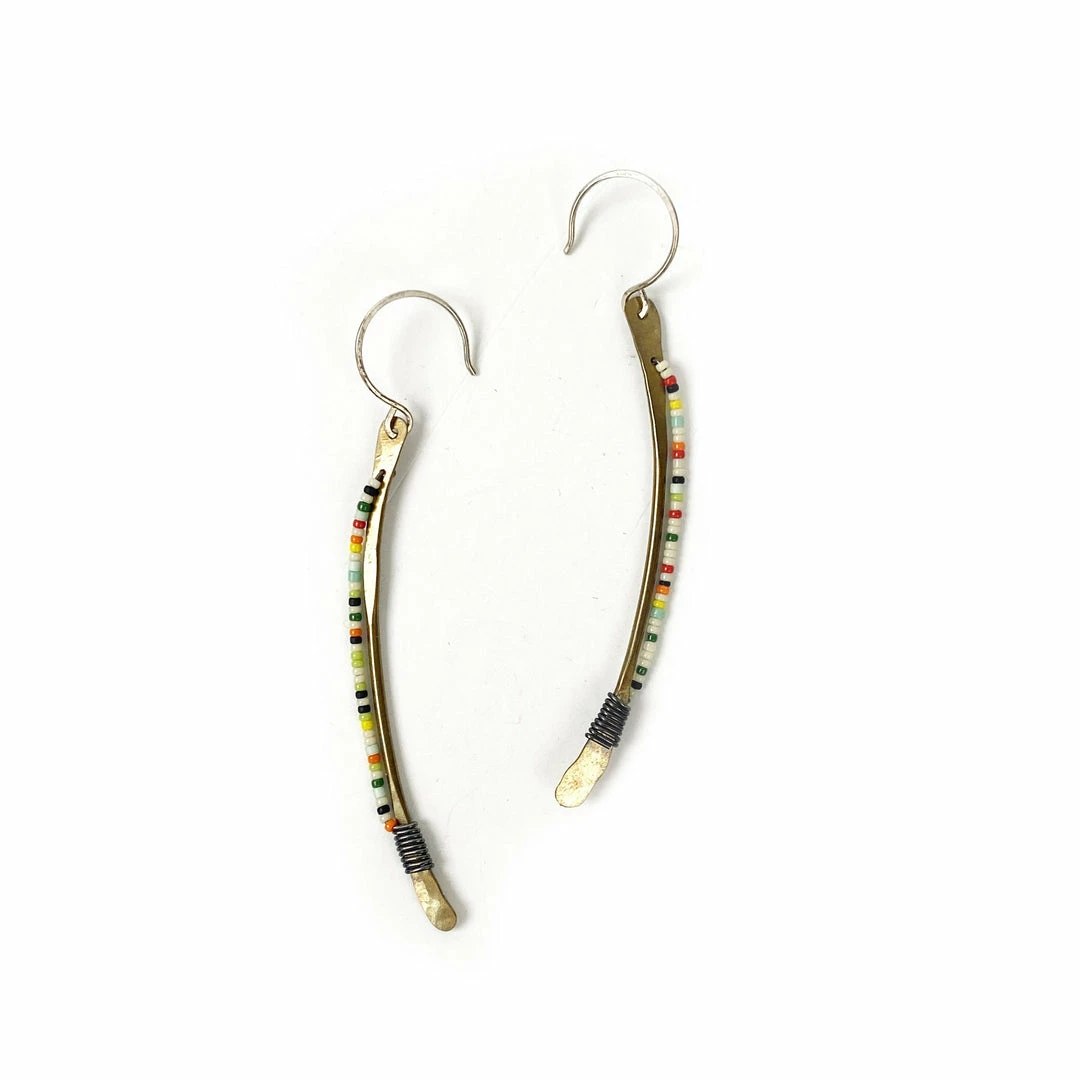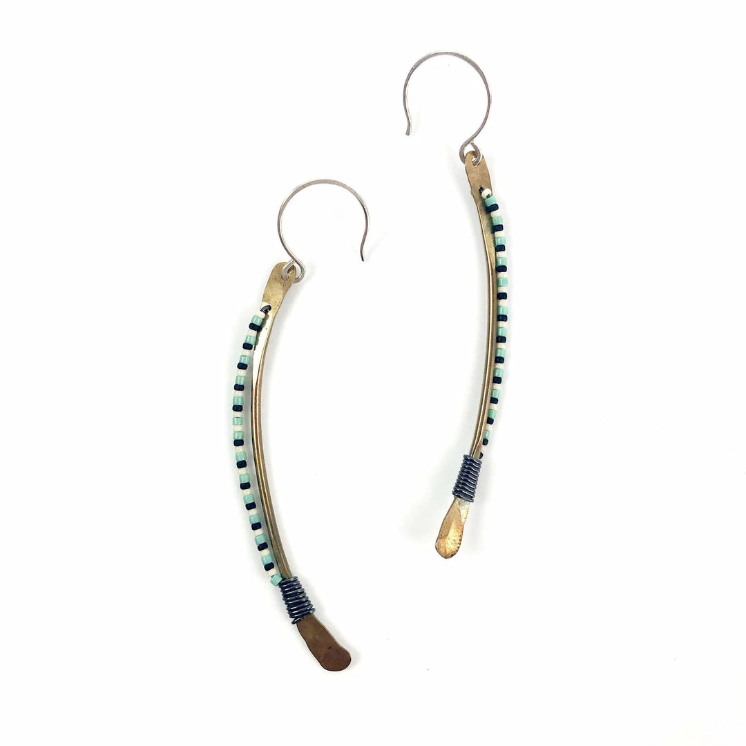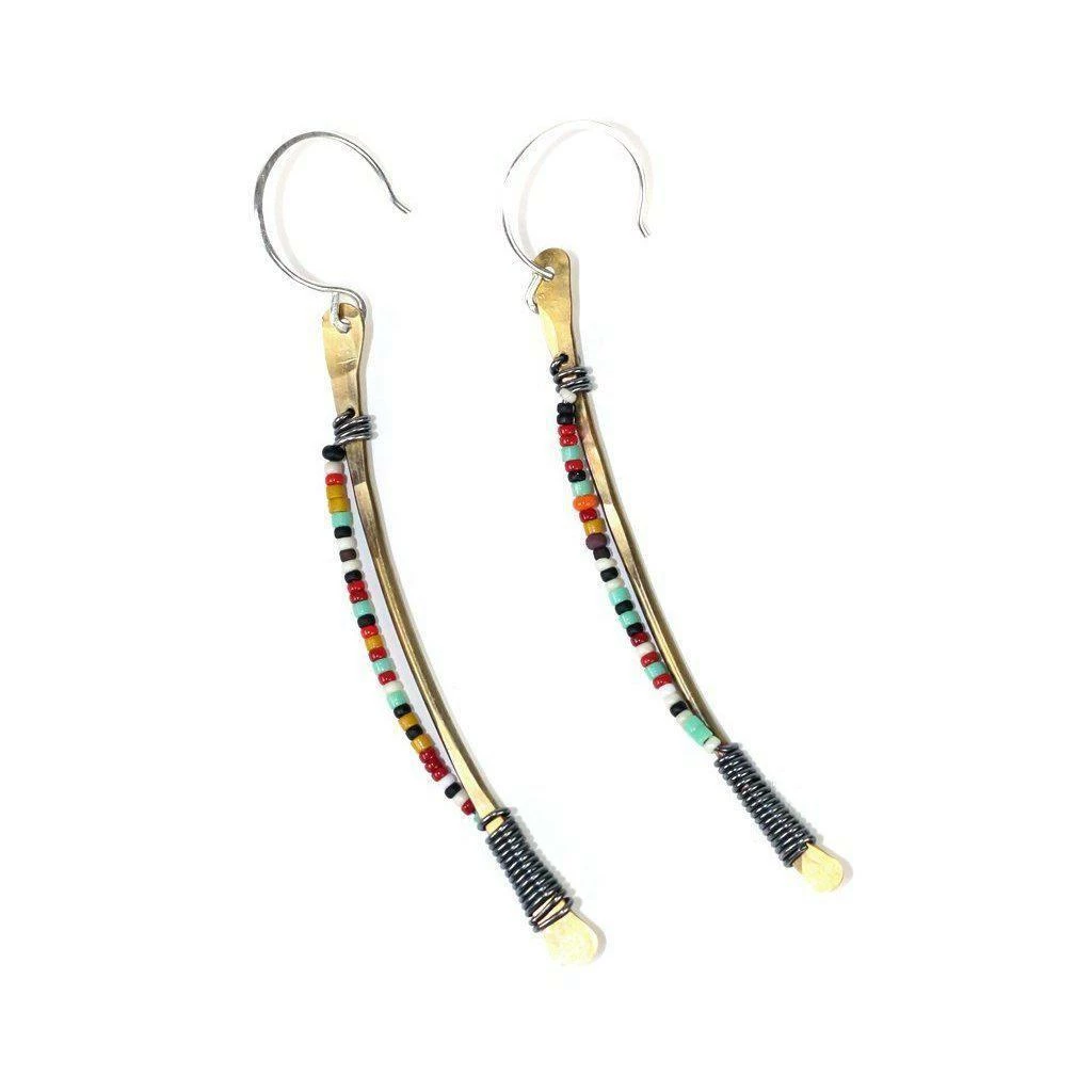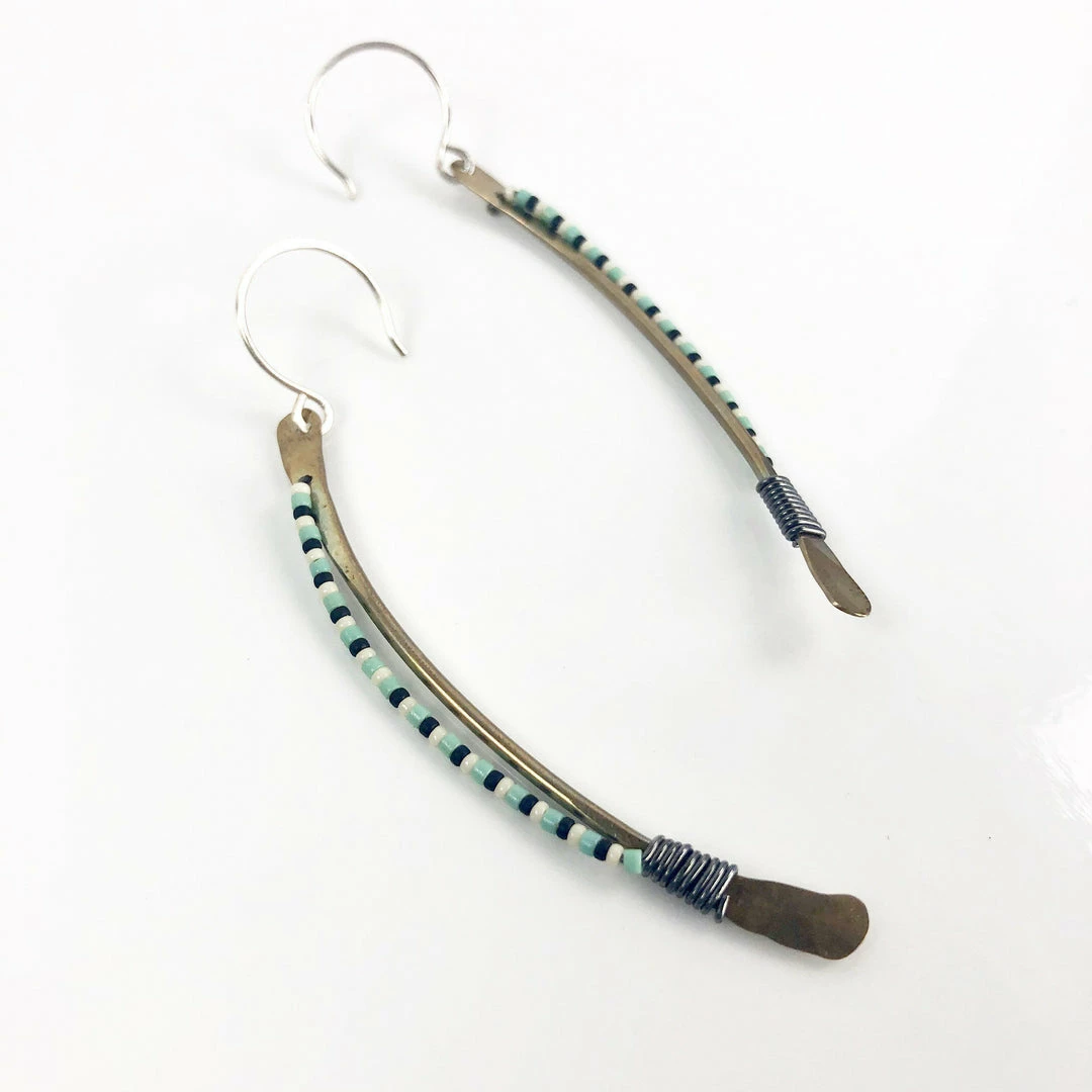 These earrings are a favorite for anyone that wants to add a little color to their life. They have a slight tribal flare, giving them a bold look, despite their delicate shape. The earrings are made of oxidized brass wire, and vintage beads attached with finely wrapped and riveted oxidized silver wire. The ear wire is sterling silver, nickel free!