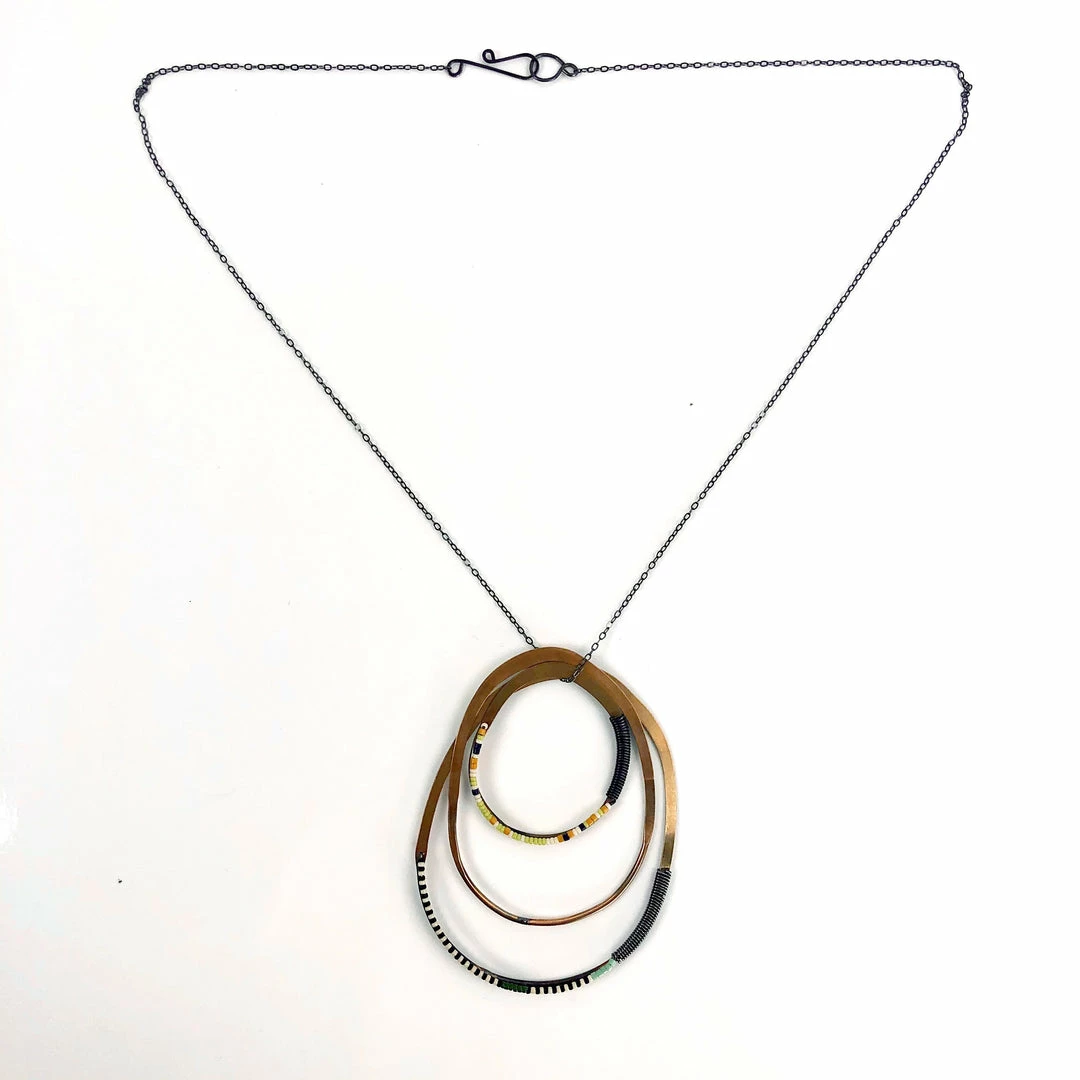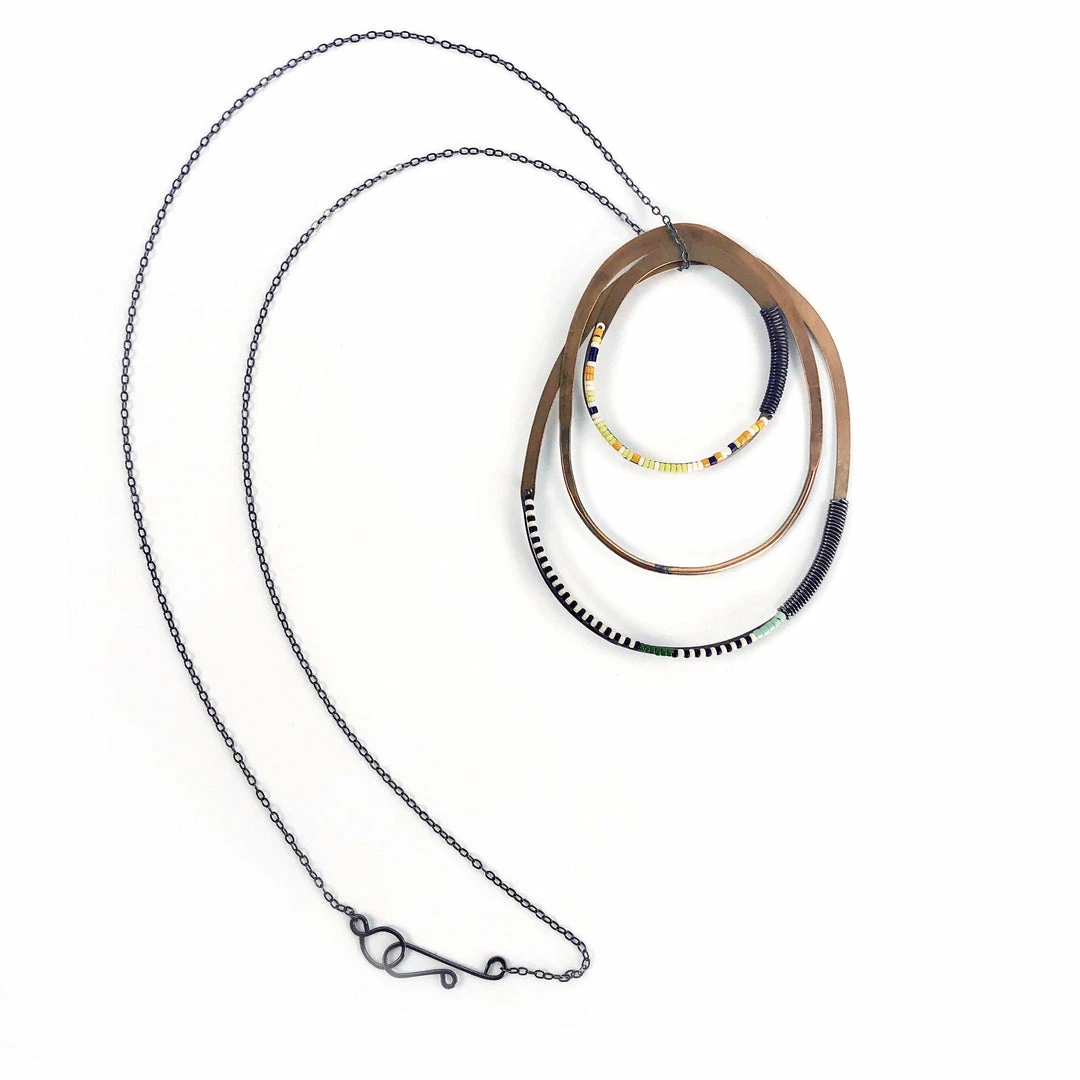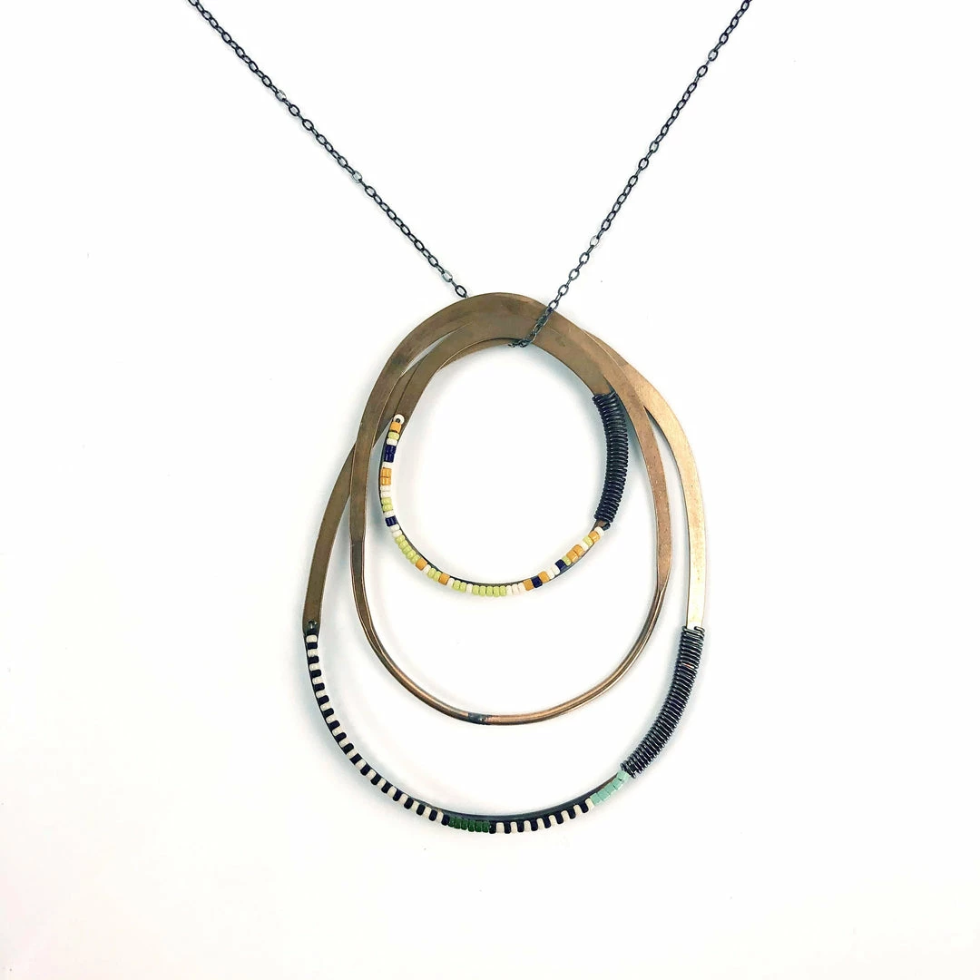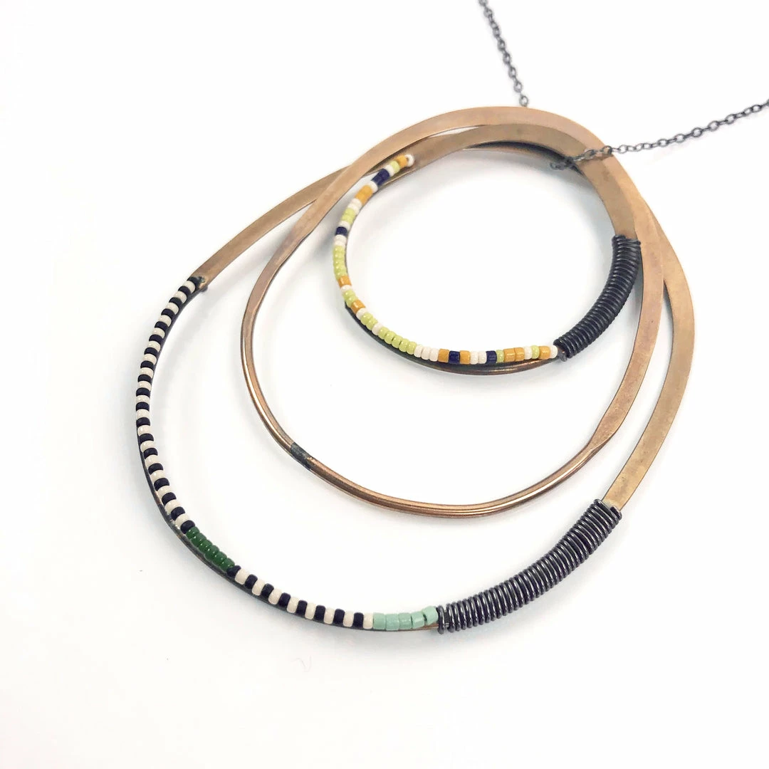 A simple yet dynamic design to accentuate any outfit, the Beaded Hoop Necklace is crafted by hand using brass, sterling silver and seed beads. This lightweight piece is whimsical and contemporary, fitting many tastes and styles. The oxidized brass gives the necklace an antique look while the tiny beads add a pop of color. Pair this piece with a casual or evening look and you’ll be ready for any occasion!