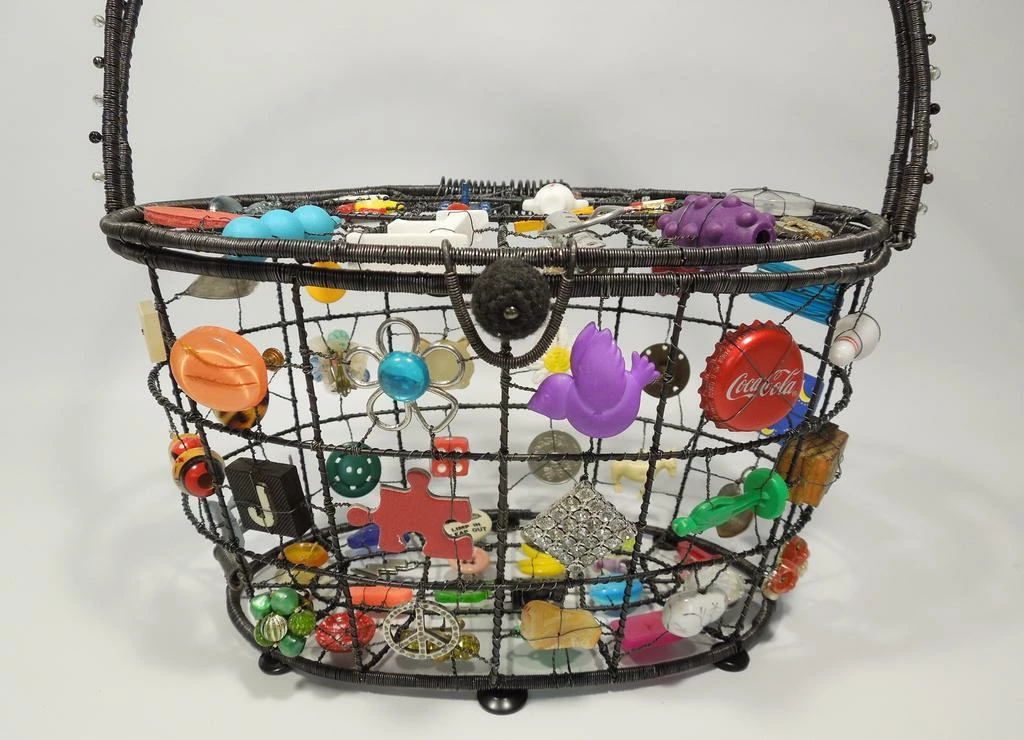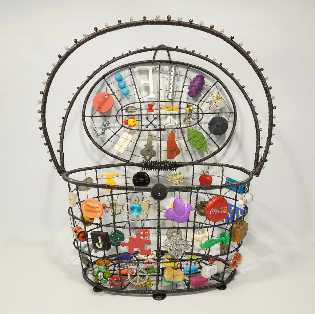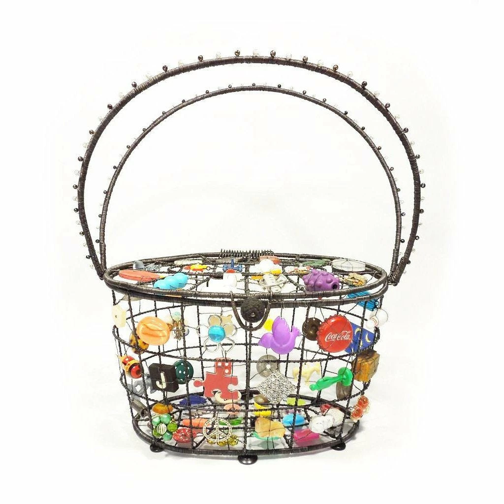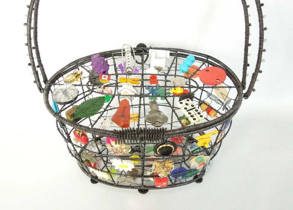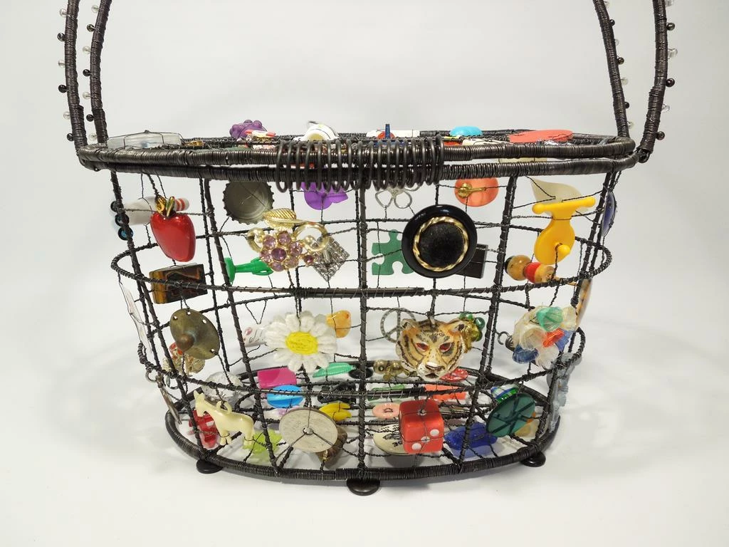 A little bit of everything, now THAT makes a statement! This OVAL, basket-shaped purse by maker/designer Sally Prangley features annealed steel with an array of accent pieces. From vintage buttons to found objects, the unique accessories add whimsy and warmth to this structured purse. Two beaded top handles allow you to carry “My Life as a Purse” and a top latch provides easy access to the interior. Pangley handcrafts each wire basket bag utilizing stainless steel, vintage beads and found objects to create one-of-a-kind pieces that are artistic, fun and functional.