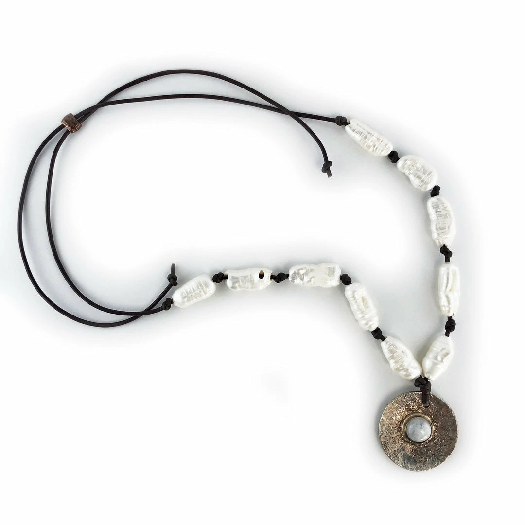 - Material: leather cord with natural pearls, silver leaf pendant with inset moonstone