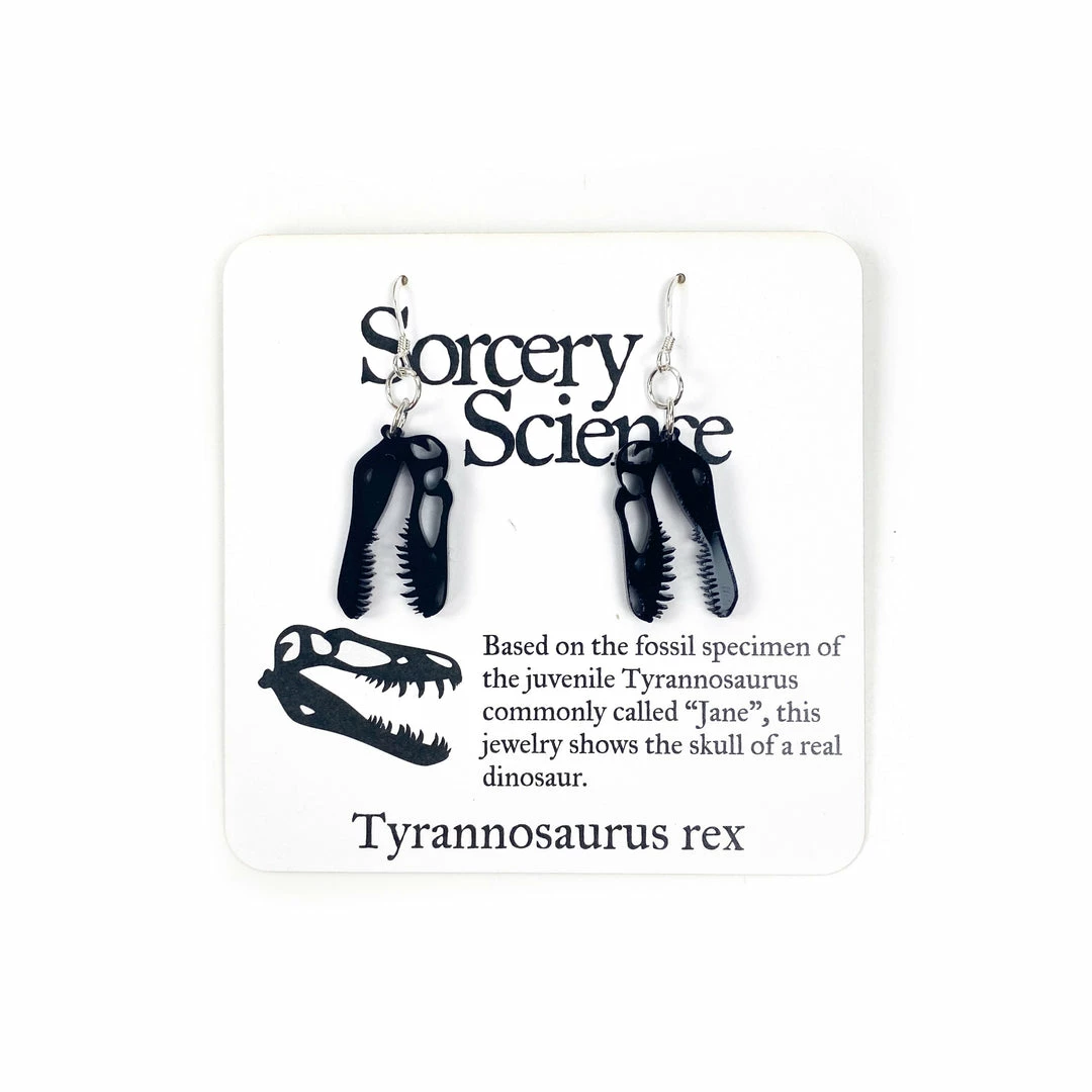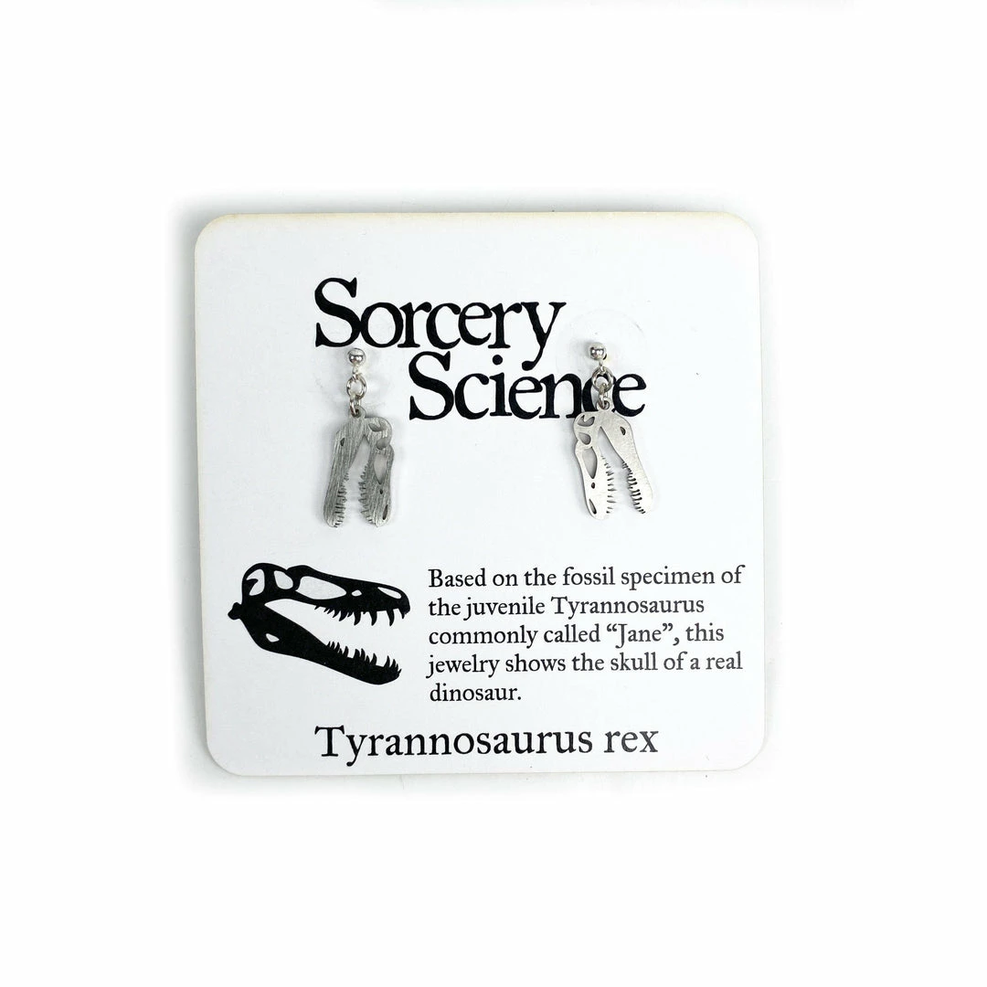 Show your love of dinosaurs with these sophisticated T Rex skull earrings! Based on the fossil specimen of the juvenile Tyrannosaurus commonly called “Jane”, this necklace is based on the skull of a real dinosaur fossil. The earrings are created from wood, not Dino bones…