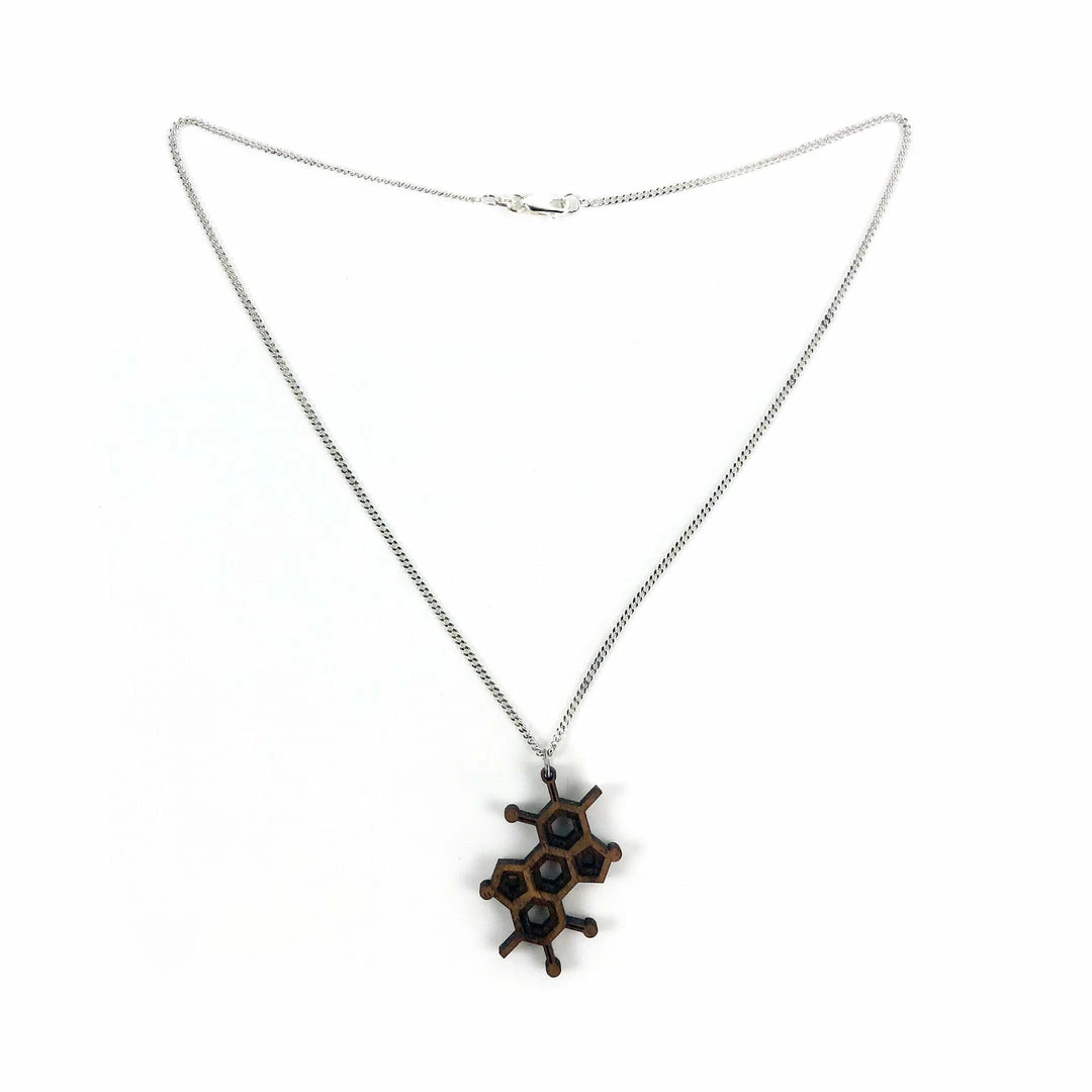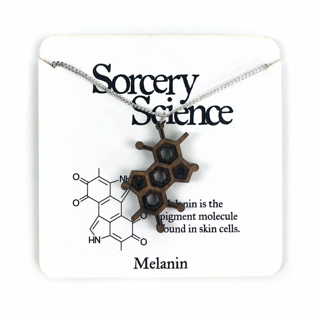 Melanin adds rich brown and black pigment to cells from our skin to our eyes. It’s even responsible for the tanning of skin exposed to sunlight. Celebrate this feature with the Melanin Molecule Necklace! The naturally stained wood pennant pops with artistic detail, perfect for a casual or dressy look. Get your color on!