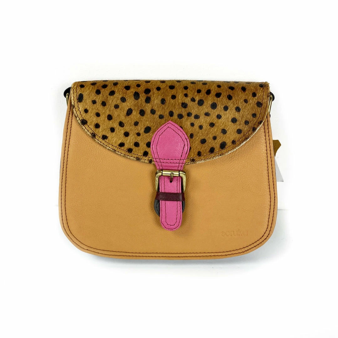 Soruka bags are designed in Barcelona and handmade though fair trade practices in India. The bags utilize recycled leather scraps that may include some imperfections and are zero waste. No two bags are the same.