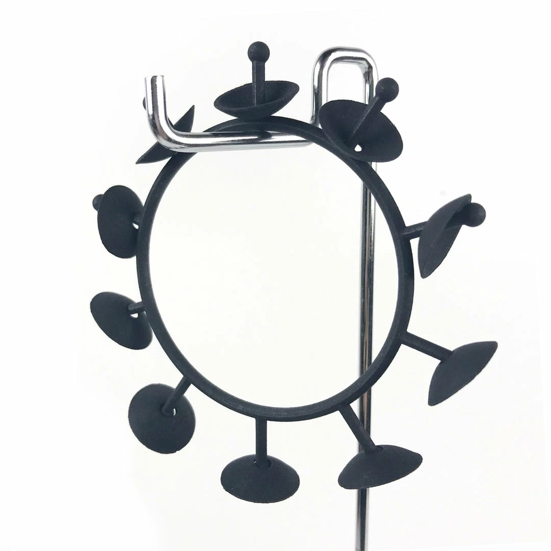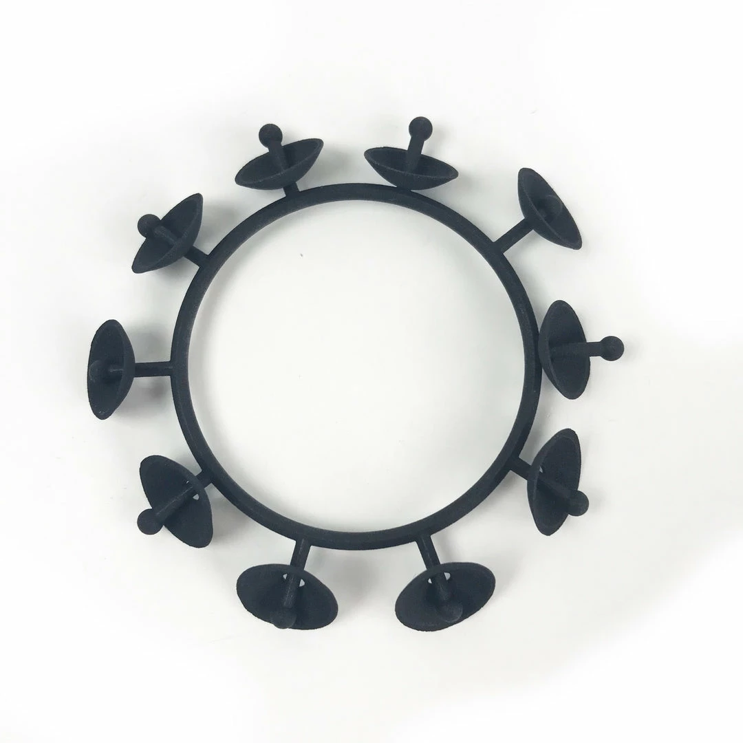 Beautiful 3D printed bracelets by Susan Sanders. This bracelet has a static bangle with spokes and then features moveable cap like beads at the end of the spokes. Lite weight matte black plastic material. Measurement was made from the inner diameter.