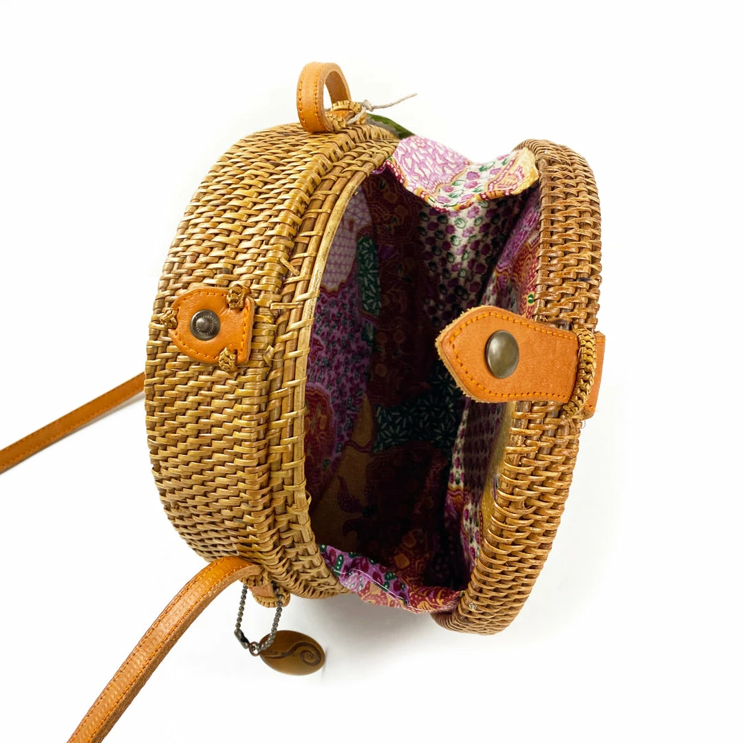 Handcrafted by master artisan weavers in Eastern Bali, the Round Star Rattan Crossbody is a unique combination of design and craftsmanship you’re sure to love! The exterior features cutouts that allow the colorful Batik lining to peak through, adding whimsy to the classic basket bag style. Secured by a button closure, the interior is fully lined in colorful cotton Batik and has plenty of room for your phone, keys and other small essentials. Though perfect for everyday use (especially with the crossbody feature!), the Round Star Rattan Crossbody would be sensational for dinner on warm summer evenings.