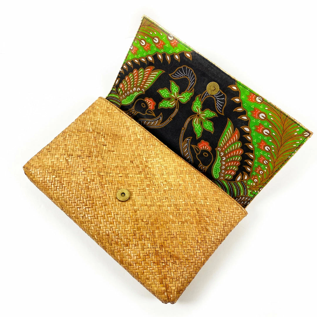 Handcrafted by artisan weavers from Eastern Bali, the Rattan Clutch is a stunning example of their skill and artistry brought to you by The Winding Road. This lightweight woven clutch is perfect for carrying all your essentials from your phone, wallet and keys to your sunglasses and Ipad in its roomy interior. The expert weaving technique makes this rattan clutch comfortable for carrying by hand or under your arm while the interior is lined in bold cotton Batik print with a zippered pocket for more secure storage. Whether you’re visiting markets abroad or sipping drinks on the patio of your local eatery, this Rattan Clutch is the perfect day-to-night summer bag!